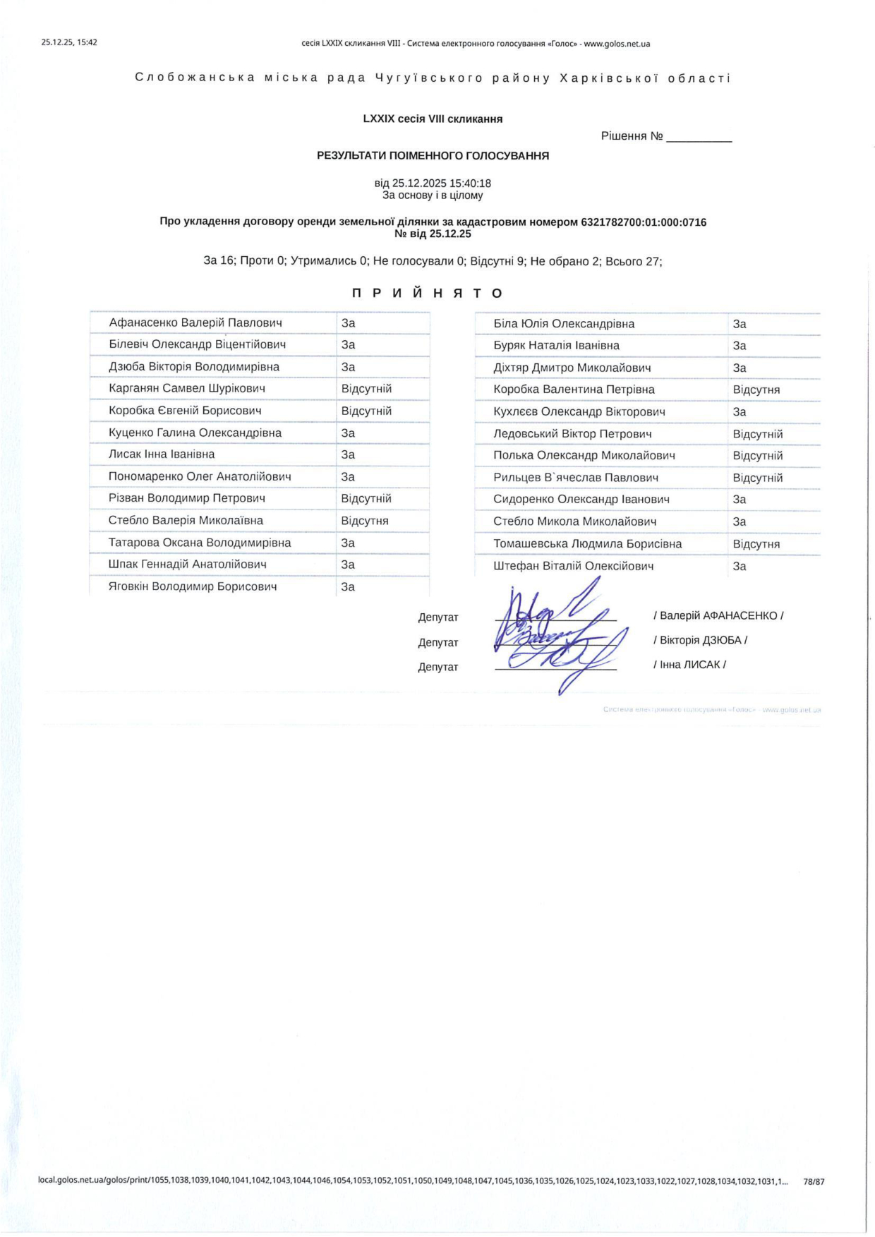 Відомості голосування до рішення сесії №3415 Про укладення договору оренди земельної ділянки за кадастровим номером 6321782700:01:000:0716