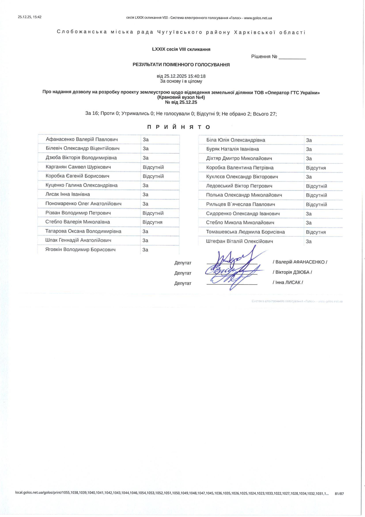 Відомості голосування до рішення сесії №3418 Про надання дозволу на розробку проекту землеустрою щодо відведення земельної ділянки ТОВ «Оператор ГТС України» (Крановий вузол №4)