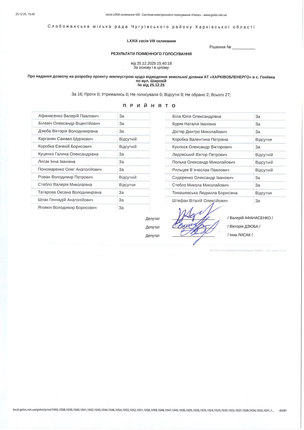 Відомості голосування до рішення сесії №3419 Про надання дозволу на розробку проекту землеустрою щодо відведення земельної ділянки АТ «ХАРКІВОБЛЕНЕРГО» в с. Геніївка по вул. Широкій