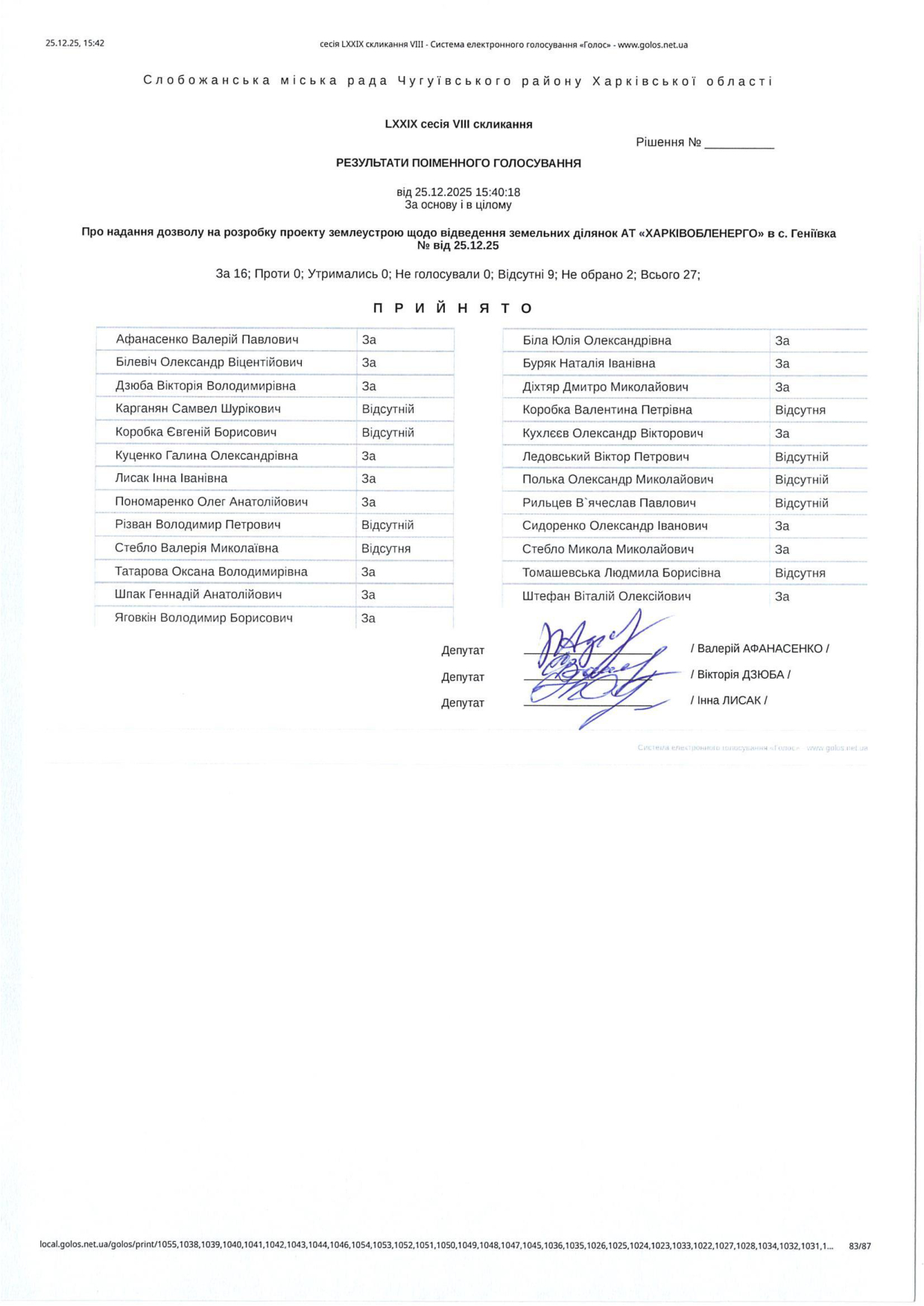 Відомості голосування до рішення сесії №3420 Про надання дозволу на розробку проекту землеустрою щодо відведення земельних ділянок АТ «ХАРКІВОБЛЕНЕРГО» в с. Геніївка