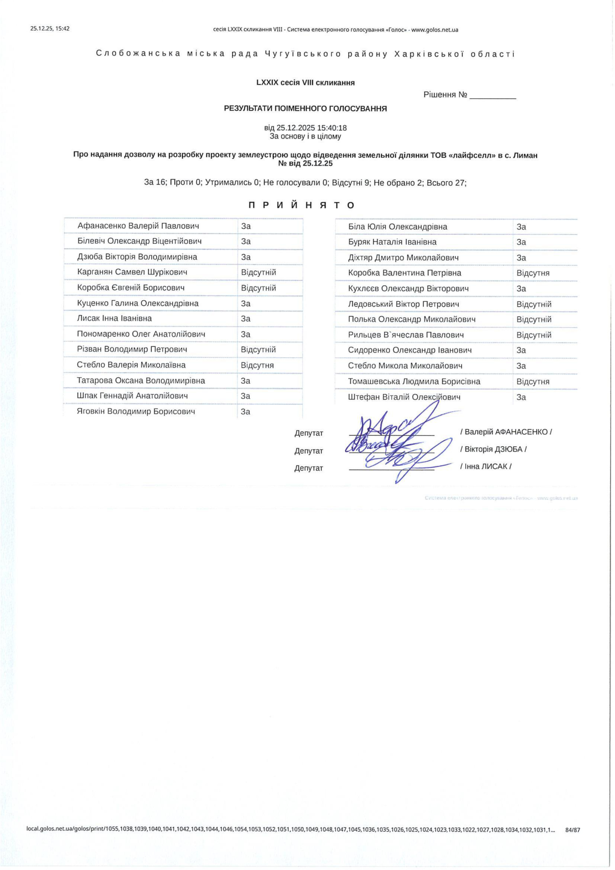 Відомості голосування до рішення сесії №3421 Про надання дозволу на розробку проекту землеустрою щодо відведення земельної ділянки ТОВ «лайфселл» в с. Лиман