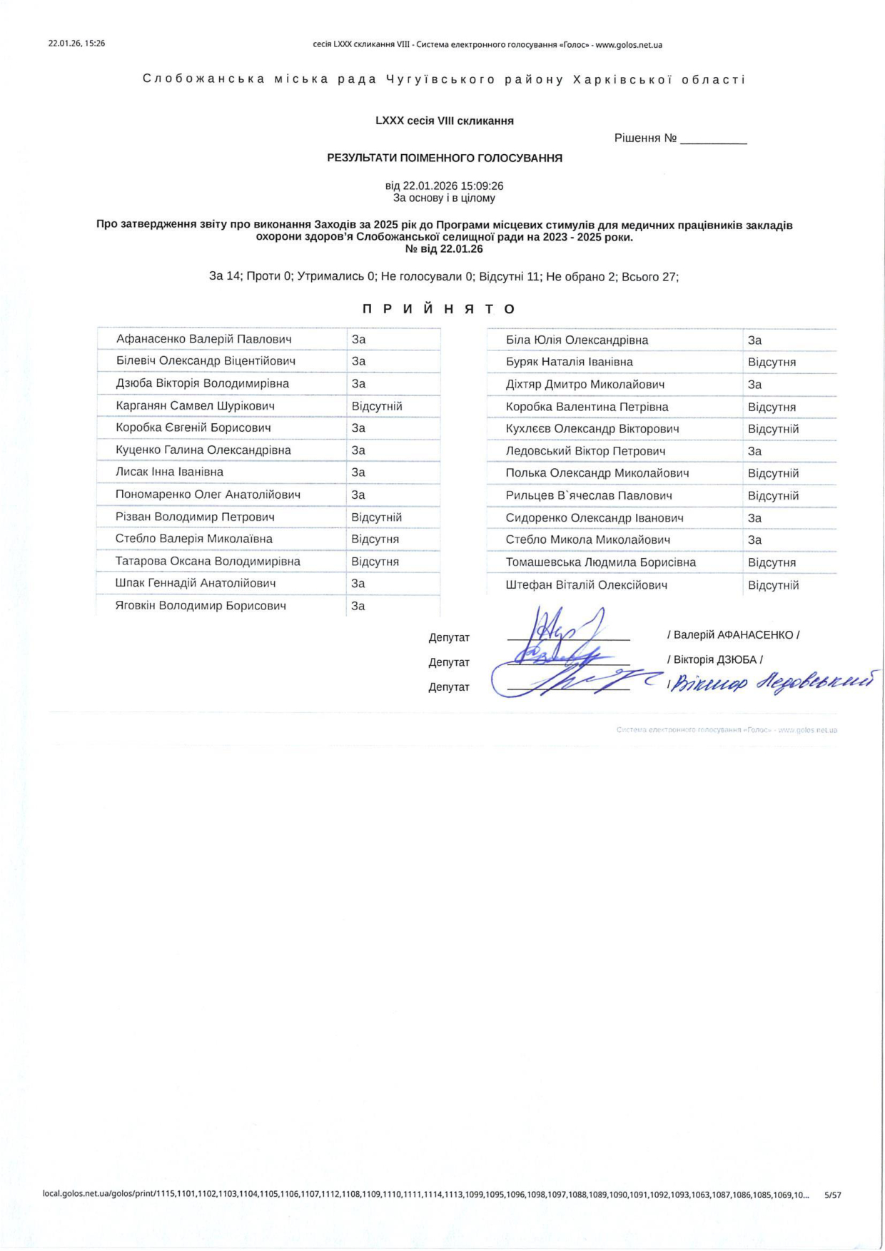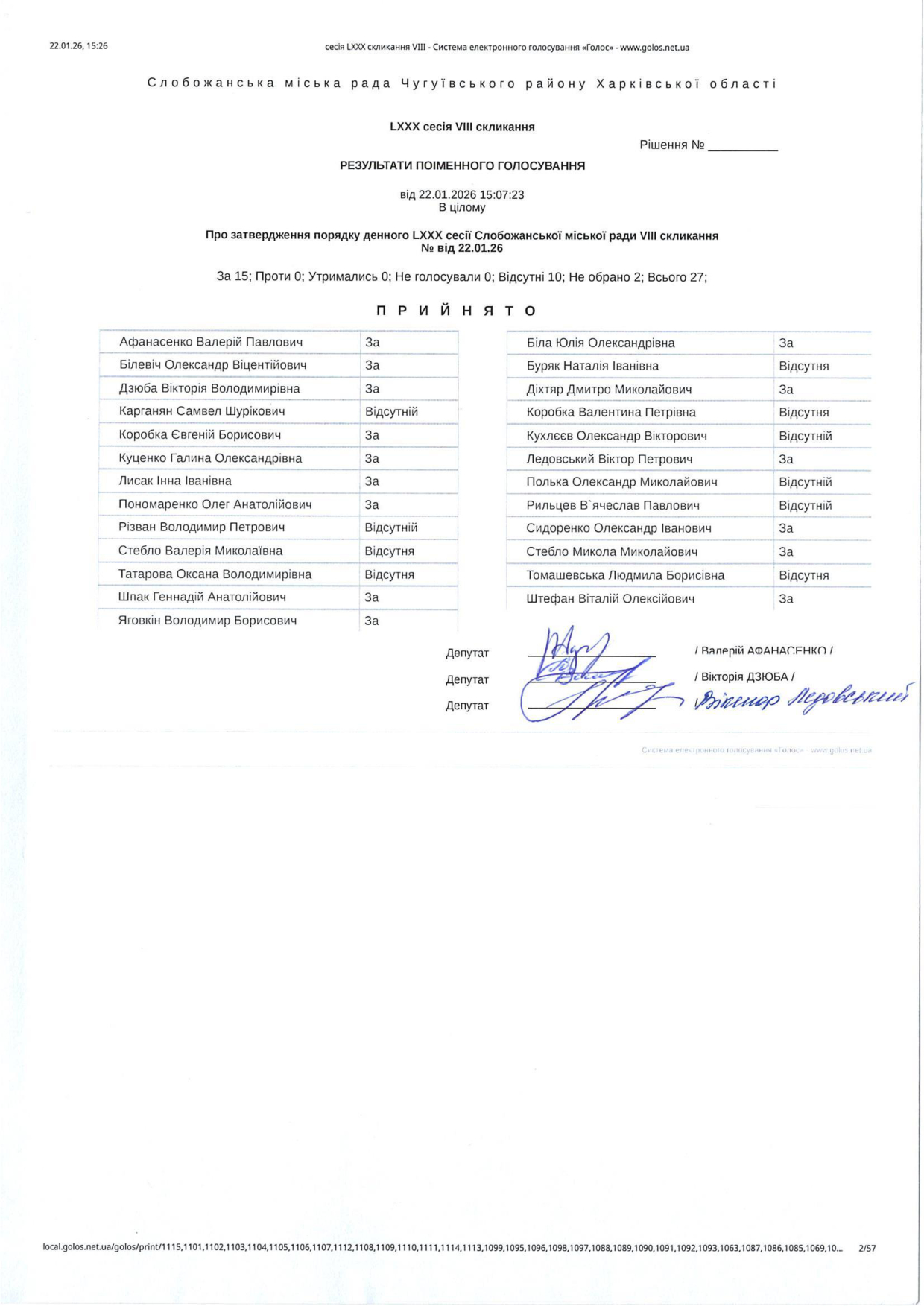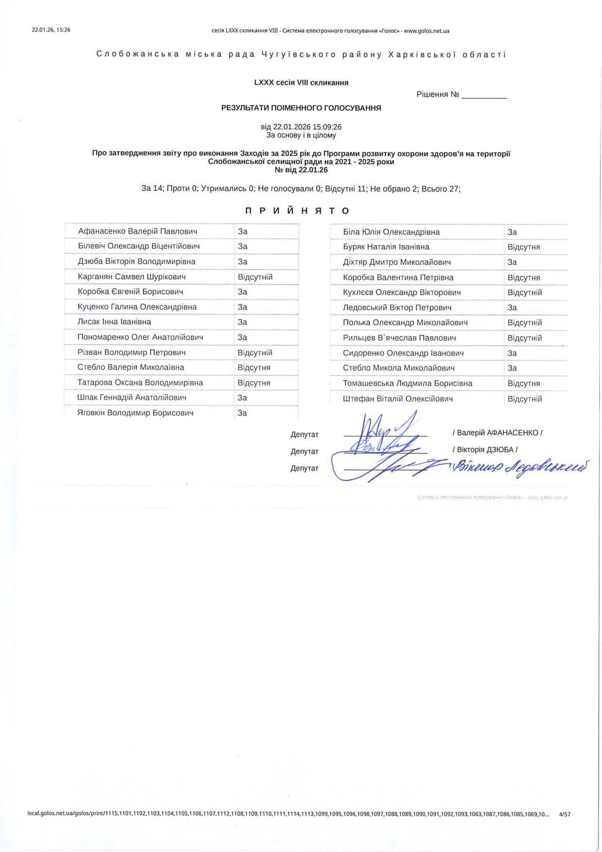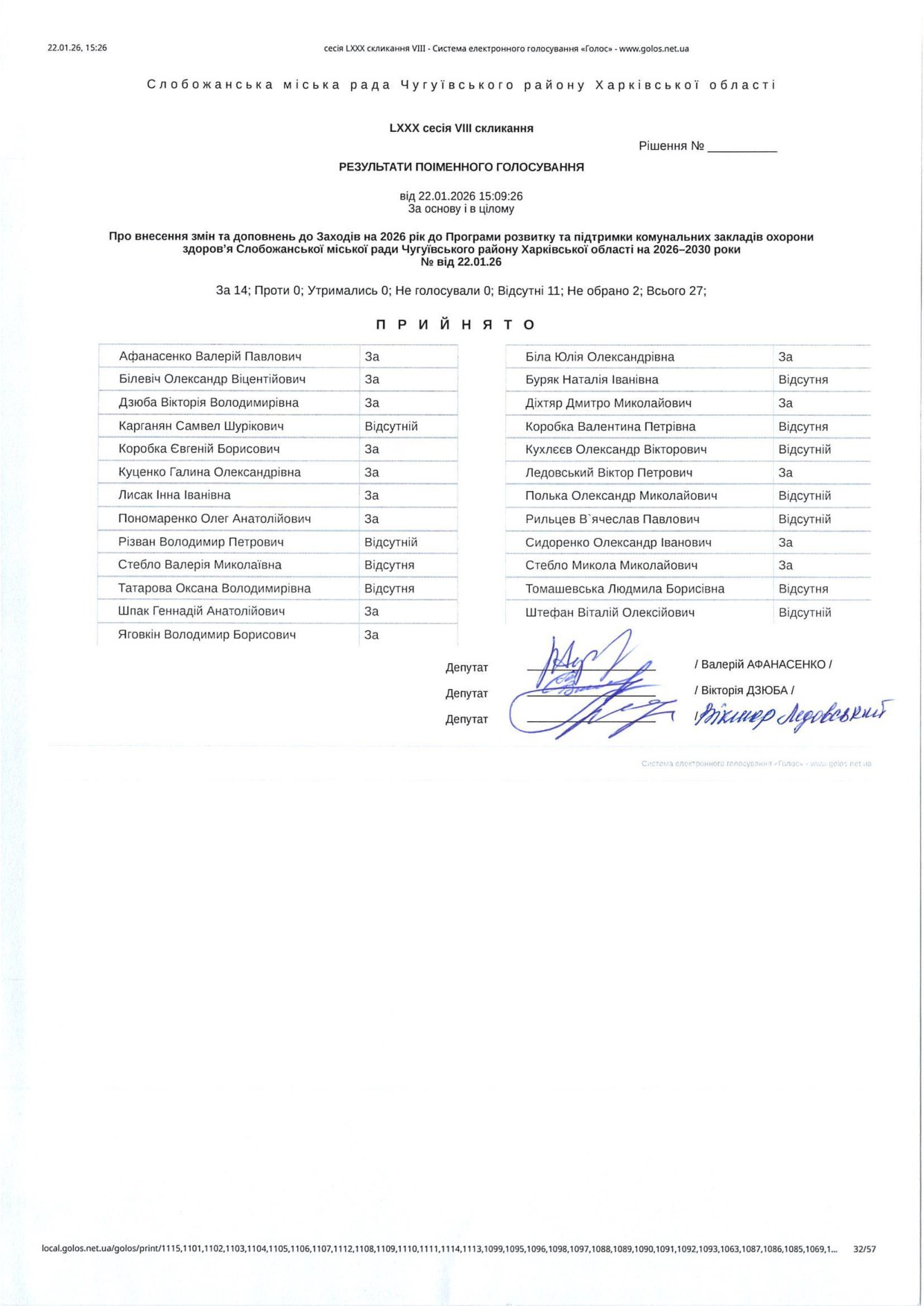 Відомості голосування до рішення сесії №3455 Про внесення змін та доповнень до Заходів на 2026 рік до Програми розвитку та підтримки комунальних закладів охорони здоров’я Слобожанської міської ради Чугуївського району Харківської області на 2026–2030 роки
