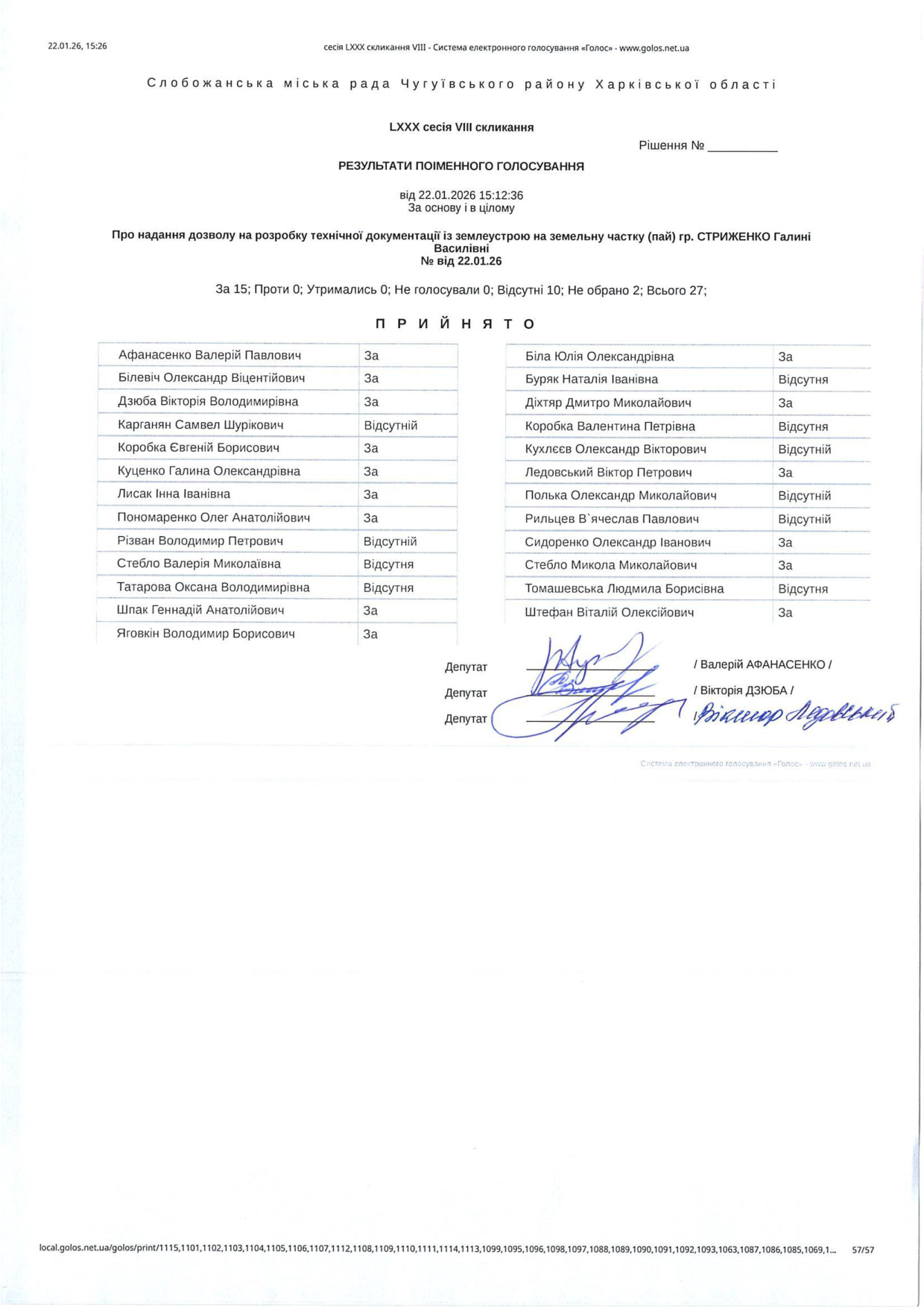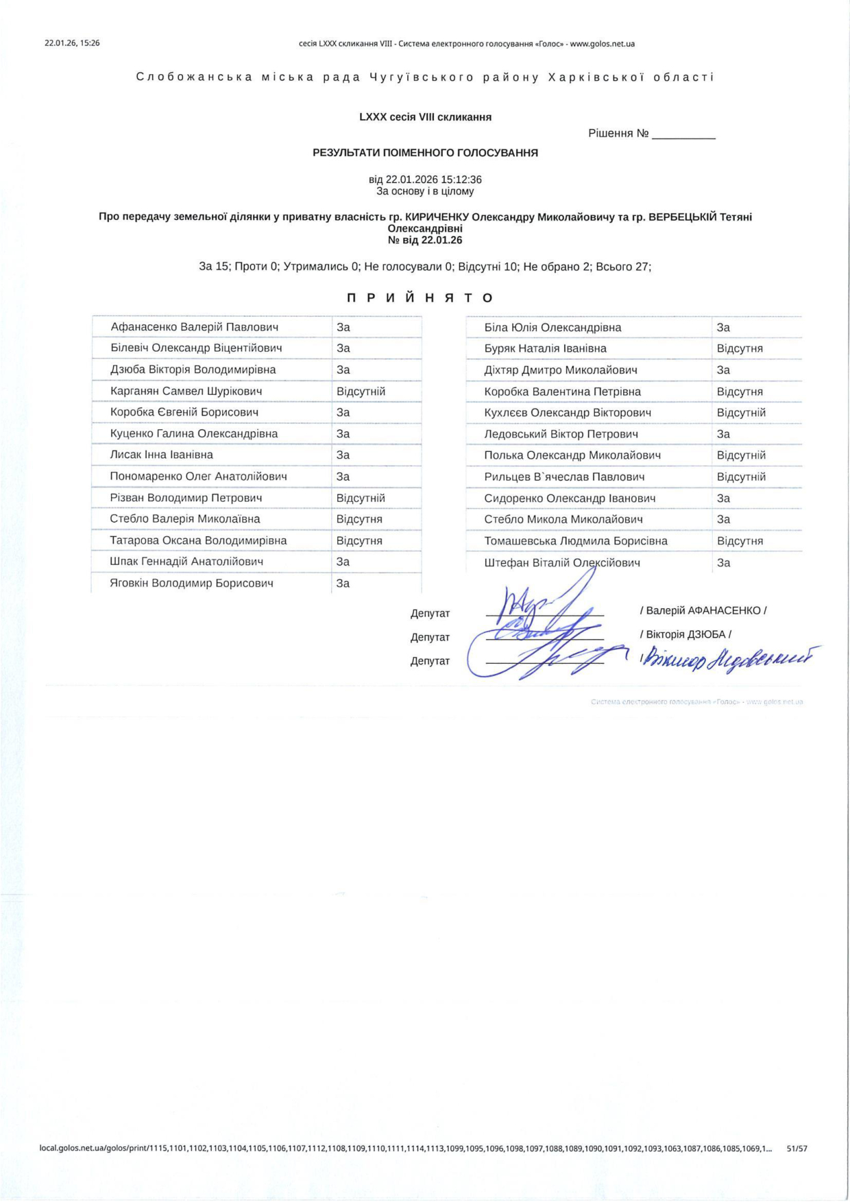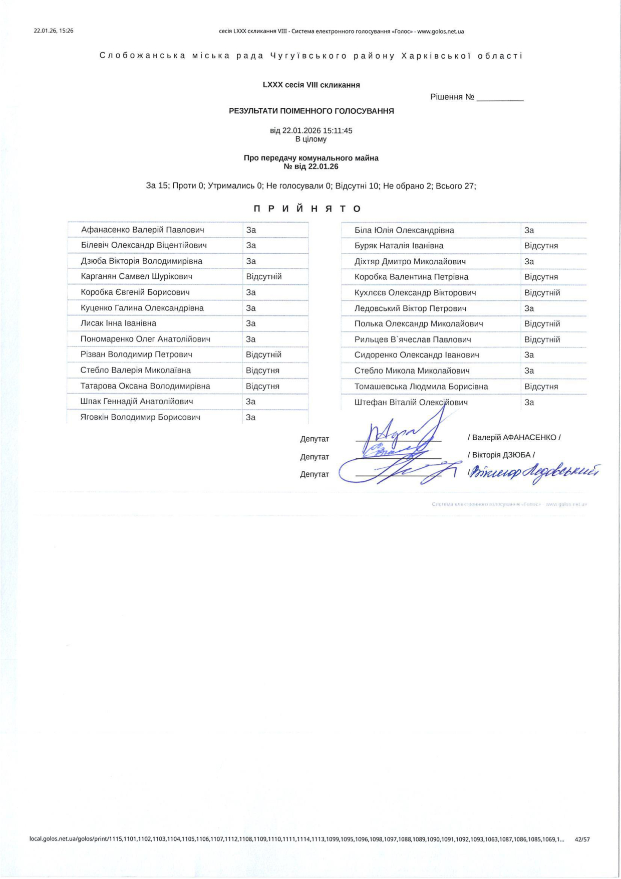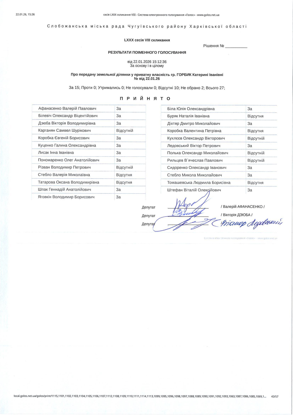 Відомості голосування до рішення сесії №3455 Про внесення змін та доповнень до Заходів на 2026 рік до Програми розвитку та підтримки комунальних закладів охорони здоров’я Слобожанської міської ради Чугуївського району Харківської області на 2026–2030 роки
