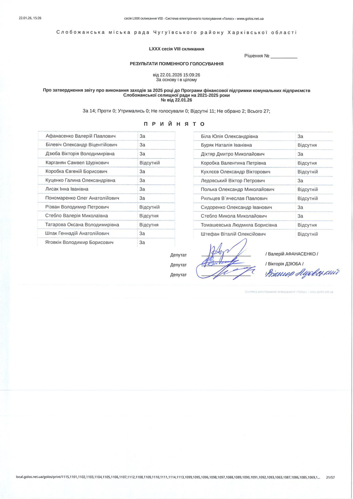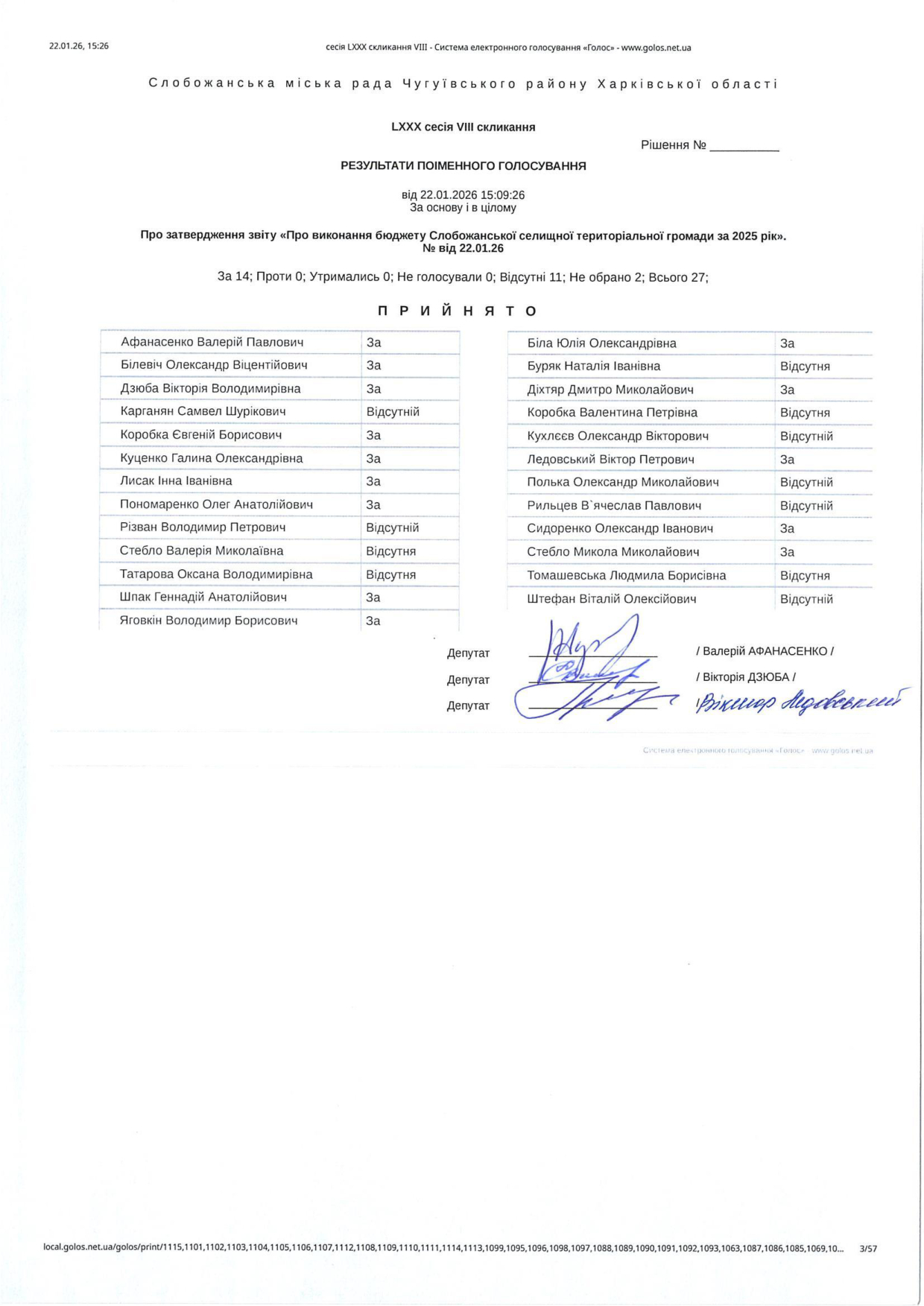 Відомості голосування до рішення сесії №3426 Про затвердження звіту «Про виконання бюджету Слобожанської селищної територіальної громади за 2025 рік»