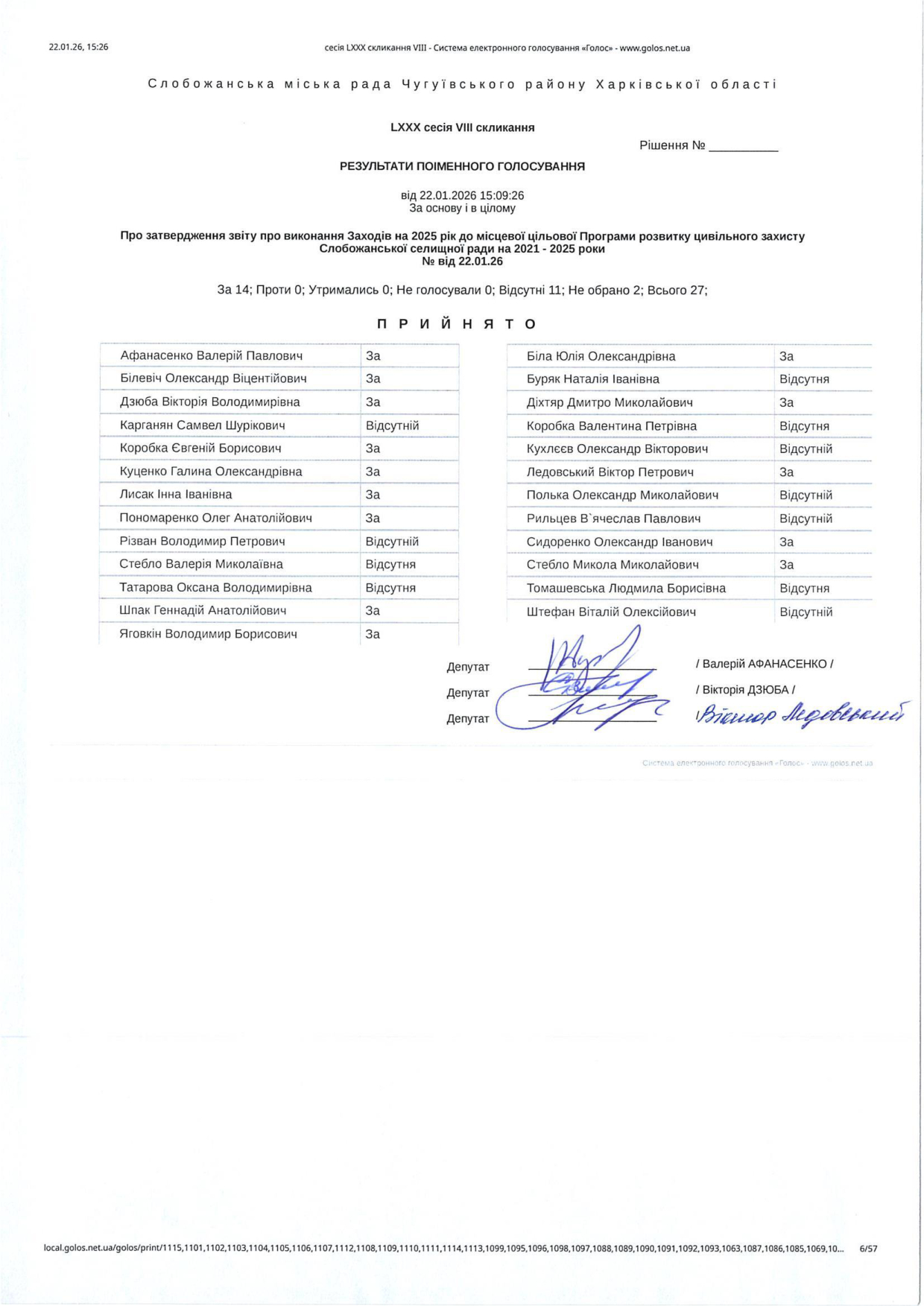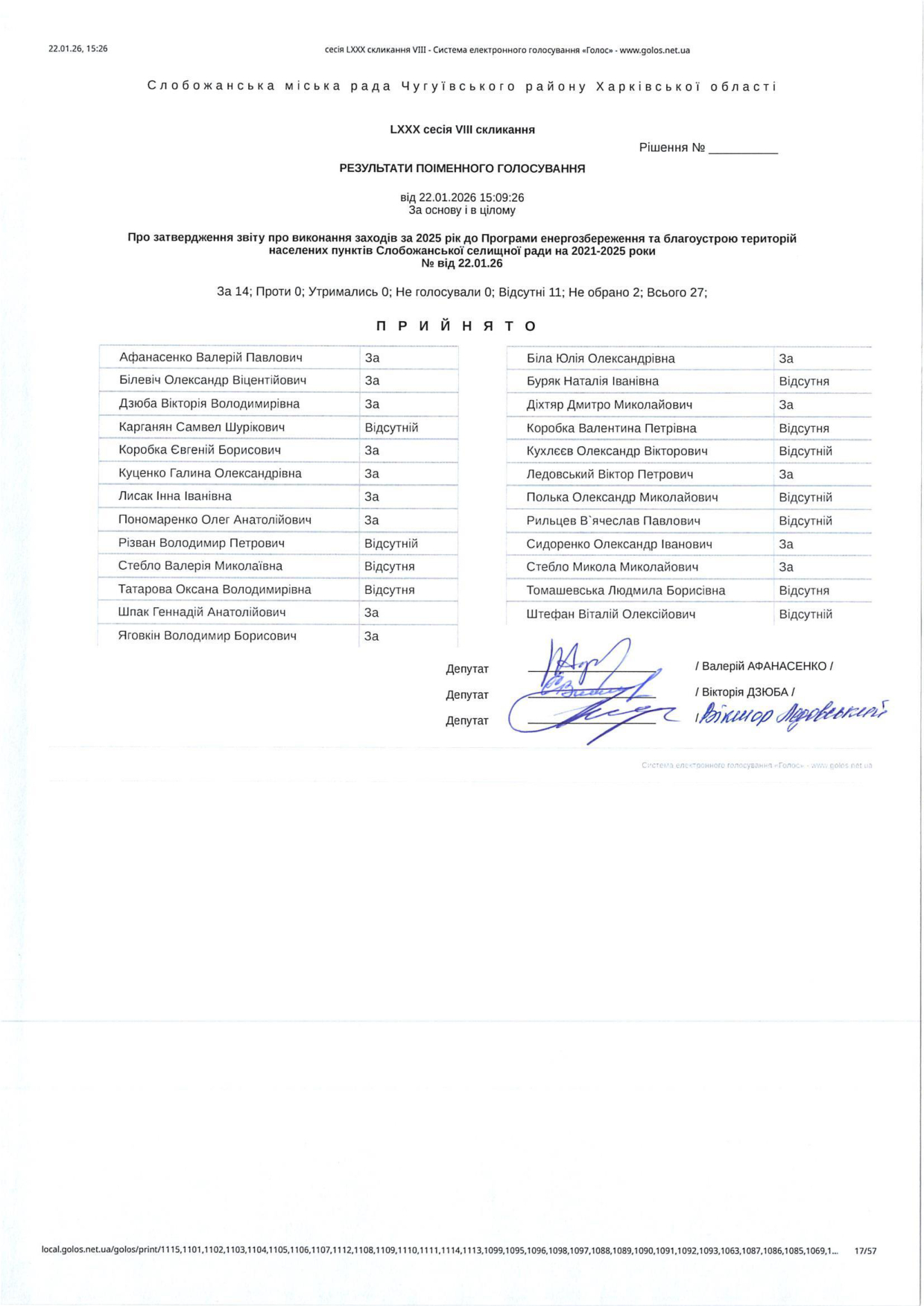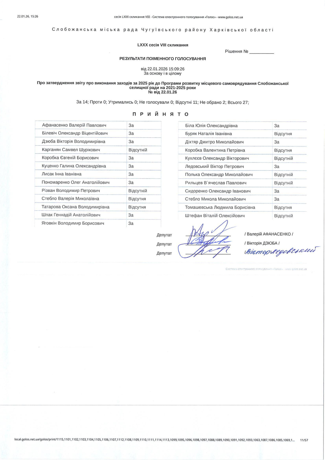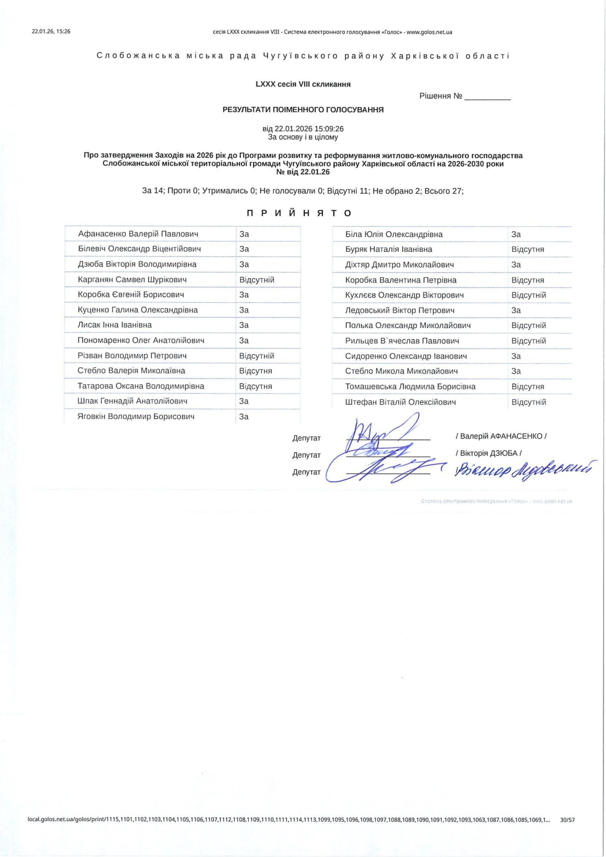 Відомості голосування до рішення сесії №3453 Про затвердження Заходів на 2026 рік до Програми розвитку та реформування житлово-комунального господарства Слобожанської міської територіальної громади Чугуївського району Харківської області на 2026-2030 роки