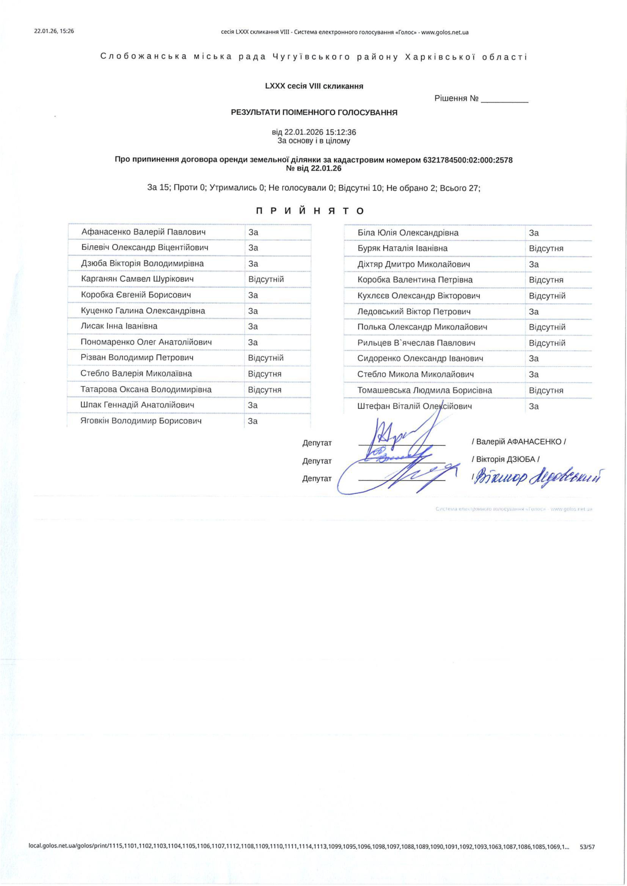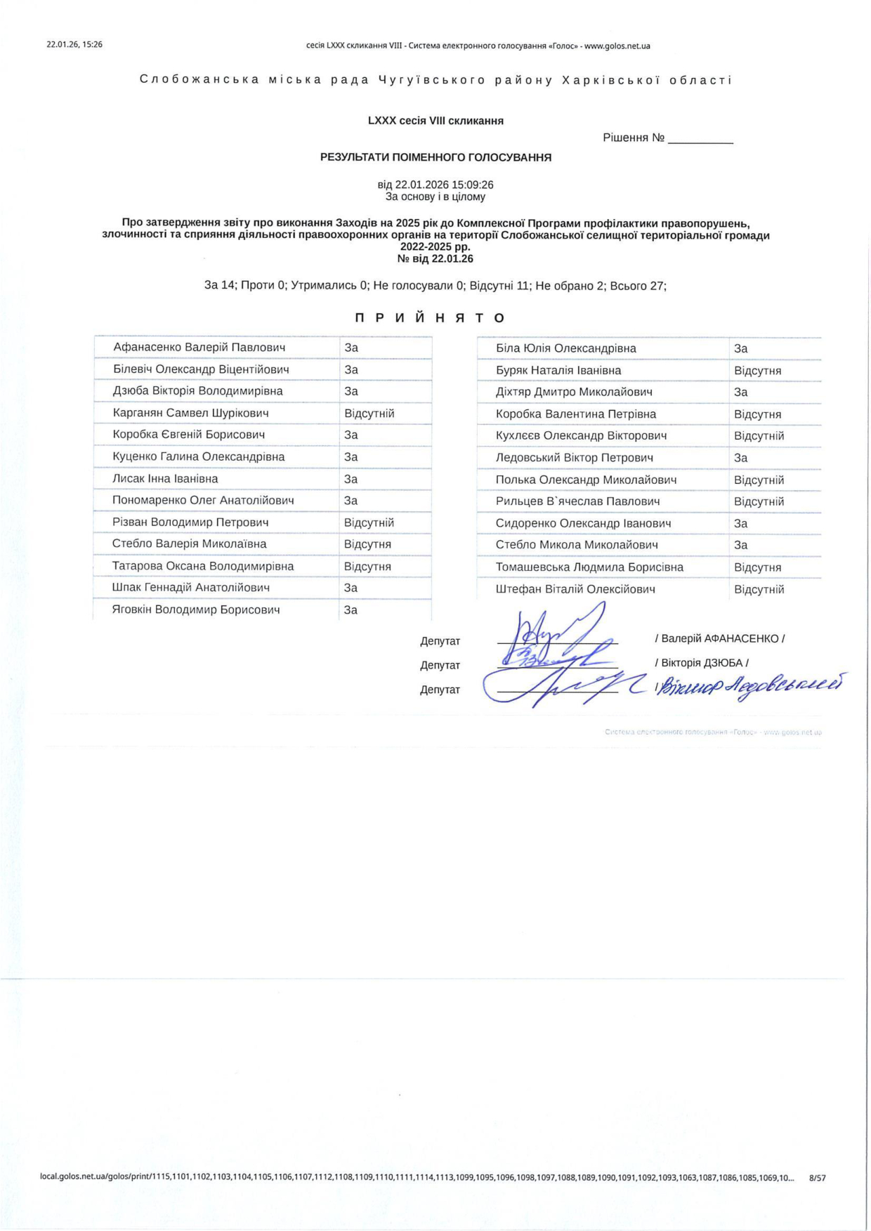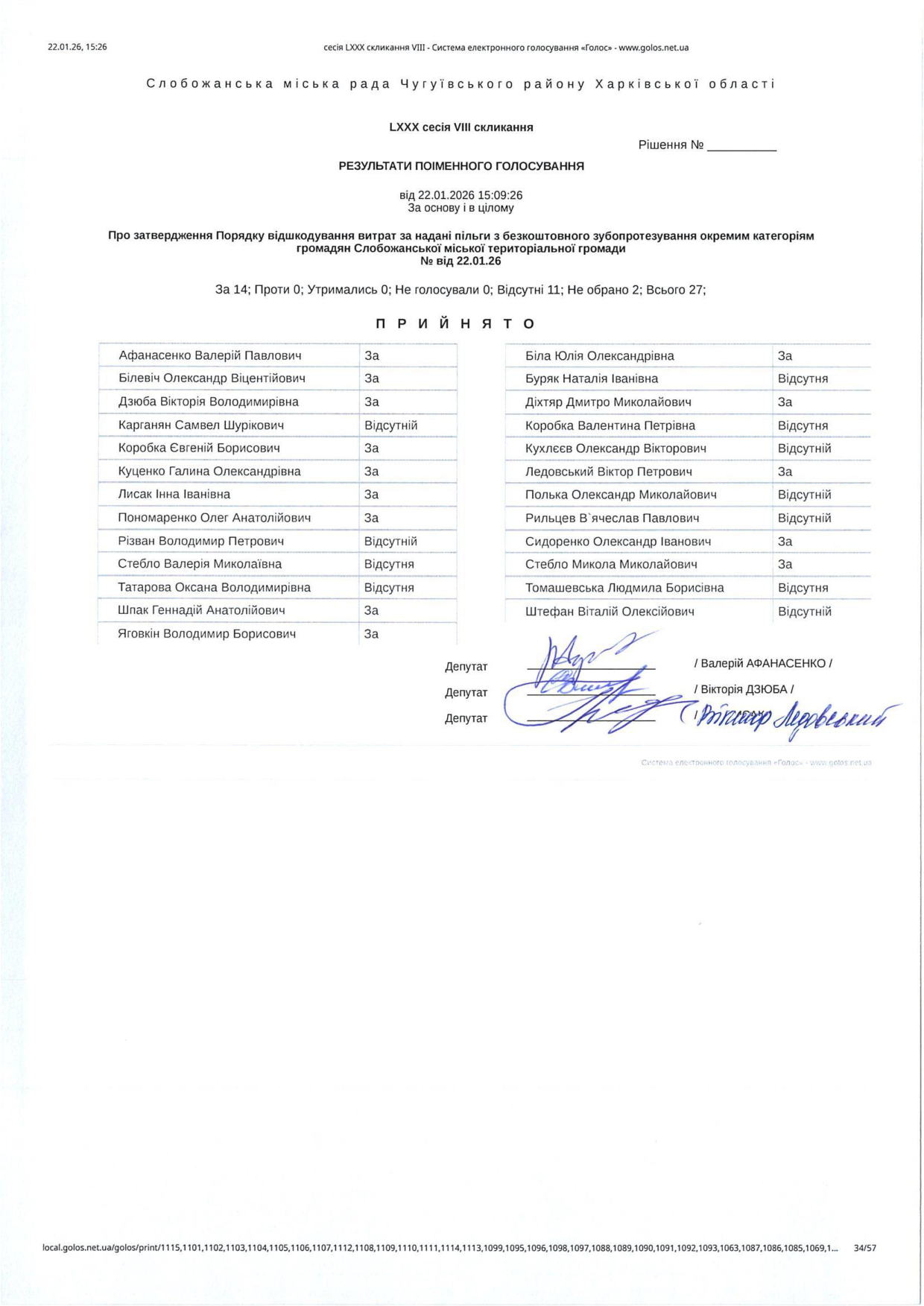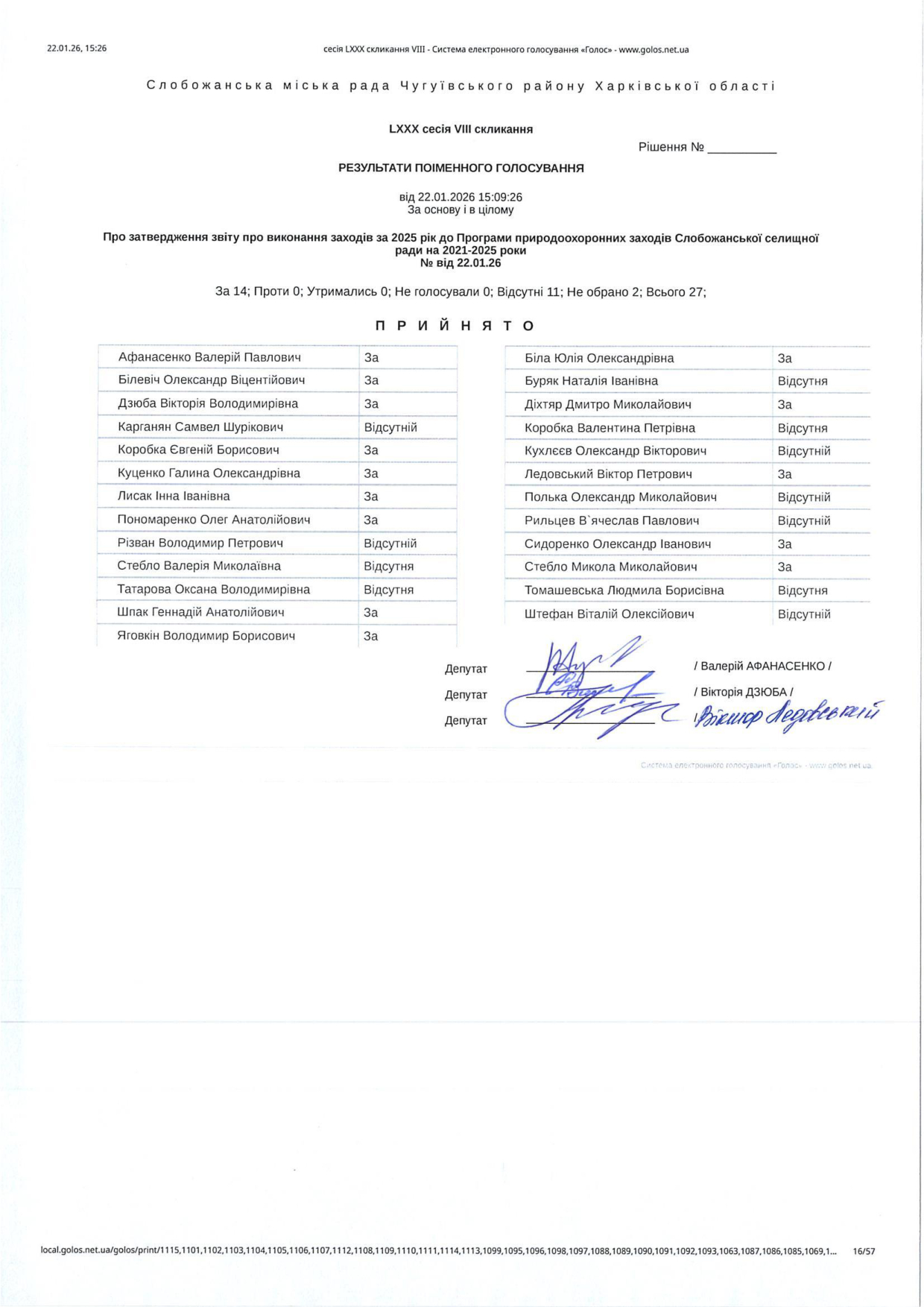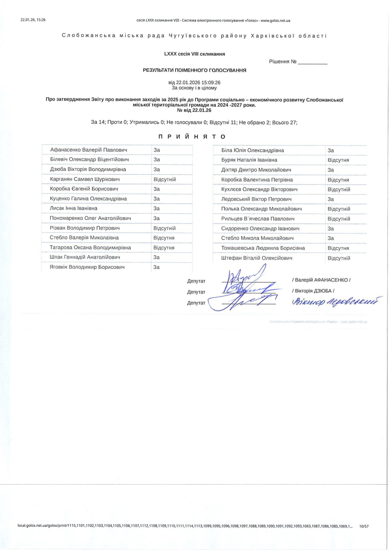 Відомості голосування до рішення сесії №3453 Про затвердження Заходів на 2026 рік до Програми розвитку та реформування житлово-комунального господарства Слобожанської міської територіальної громади Чугуївського району Харківської області на 2026-2030 роки