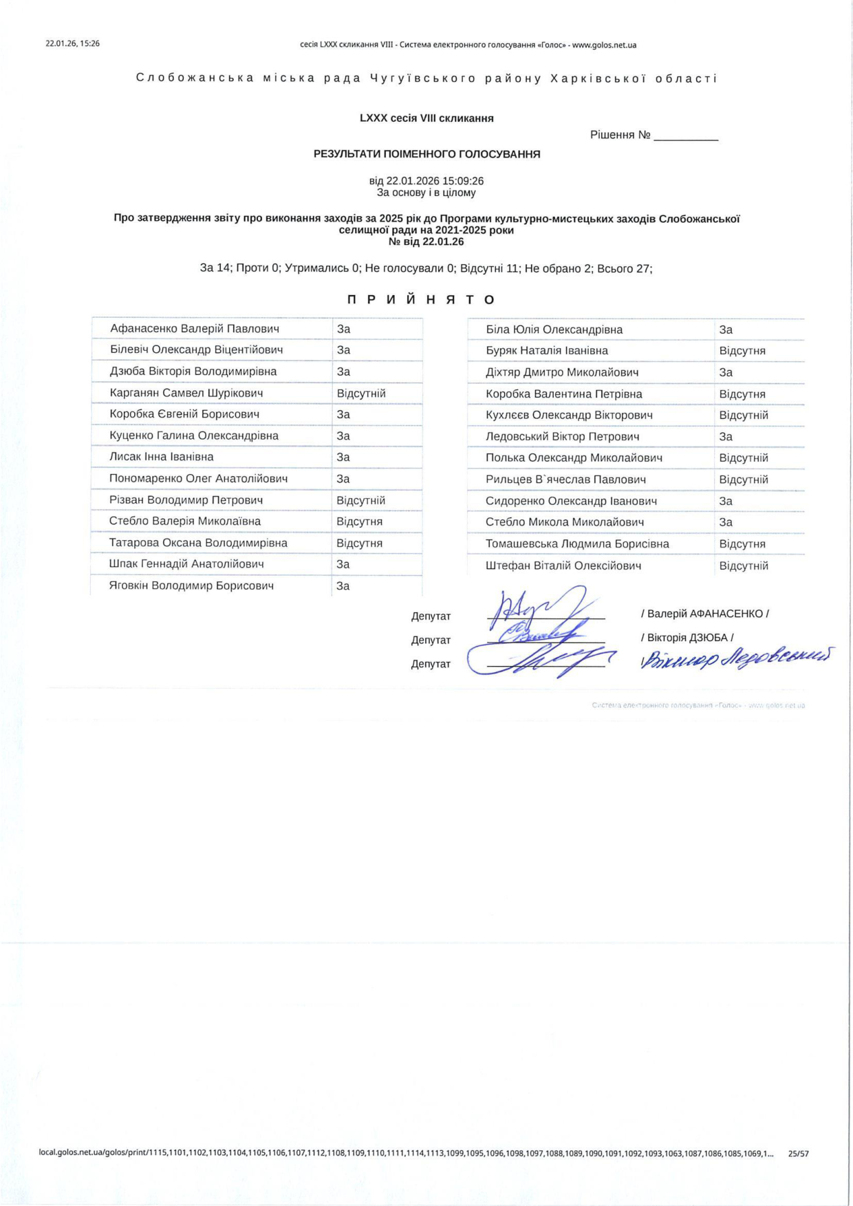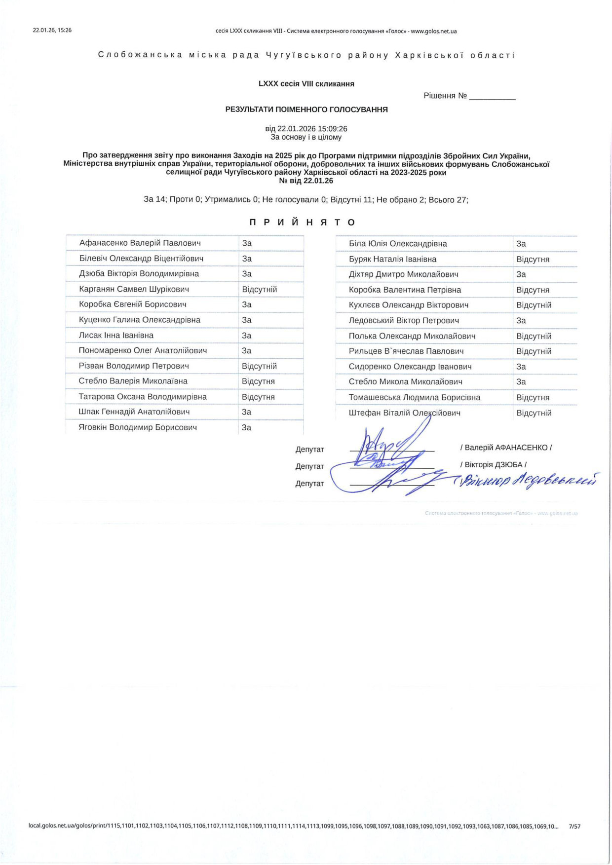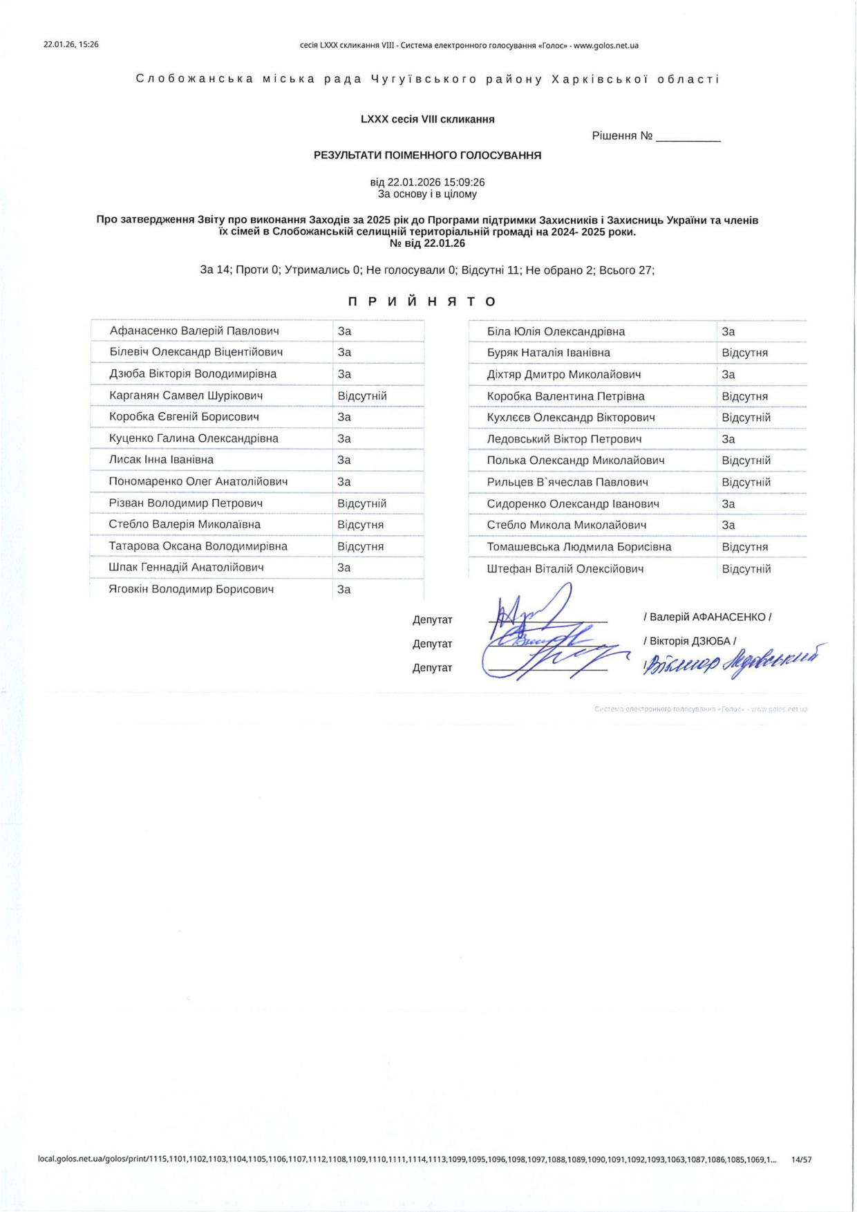 Відомості голосування до рішення сесії №3437 Про затвердження Звіту про виконання Заходів за 2025 рік до Програми підтримки Захисників і Захисниць України та членів їх сімей в Слобожанській селищній територіальній громаді на 2024- 2025 роки