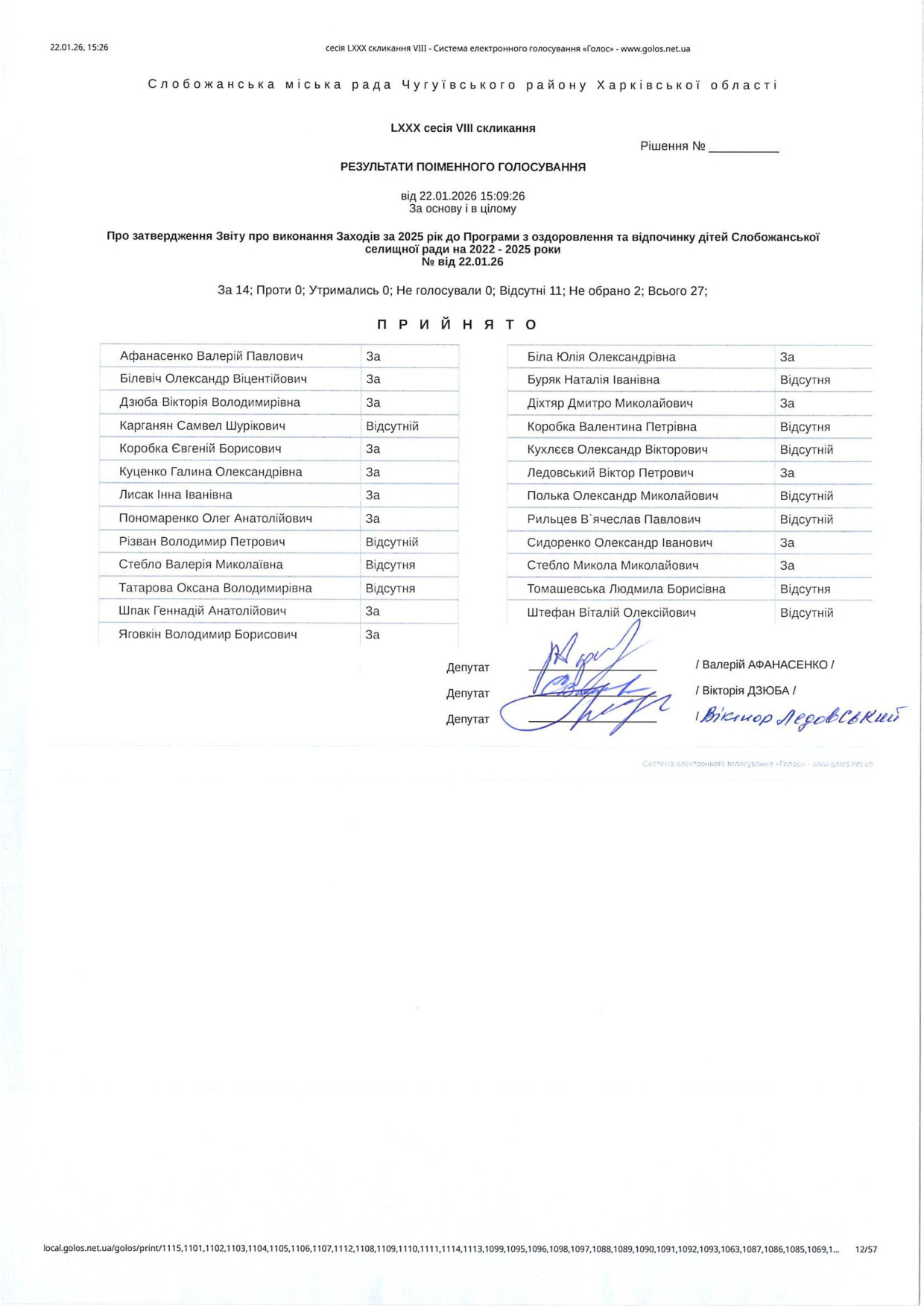 Відомості голосування до рішення сесії №3435 Про затвердження Звіту про виконання Заходів за 2025 рік до Програми з оздоровлення та відпочинку дітей Слобожанської селищної ради на 2022 - 2025 роки