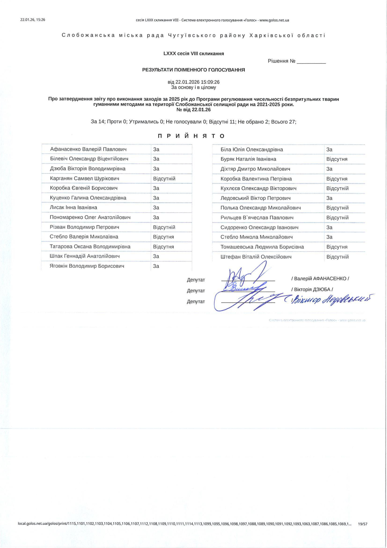 Відомості голосування до рішення сесії №3442 Про затвердження звіту про виконання заходів за 2025 рік до Програми регулювання чисельності безпритульних тварин гуманними методами на території Слобожанської селищної ради на 2021-2025 роки