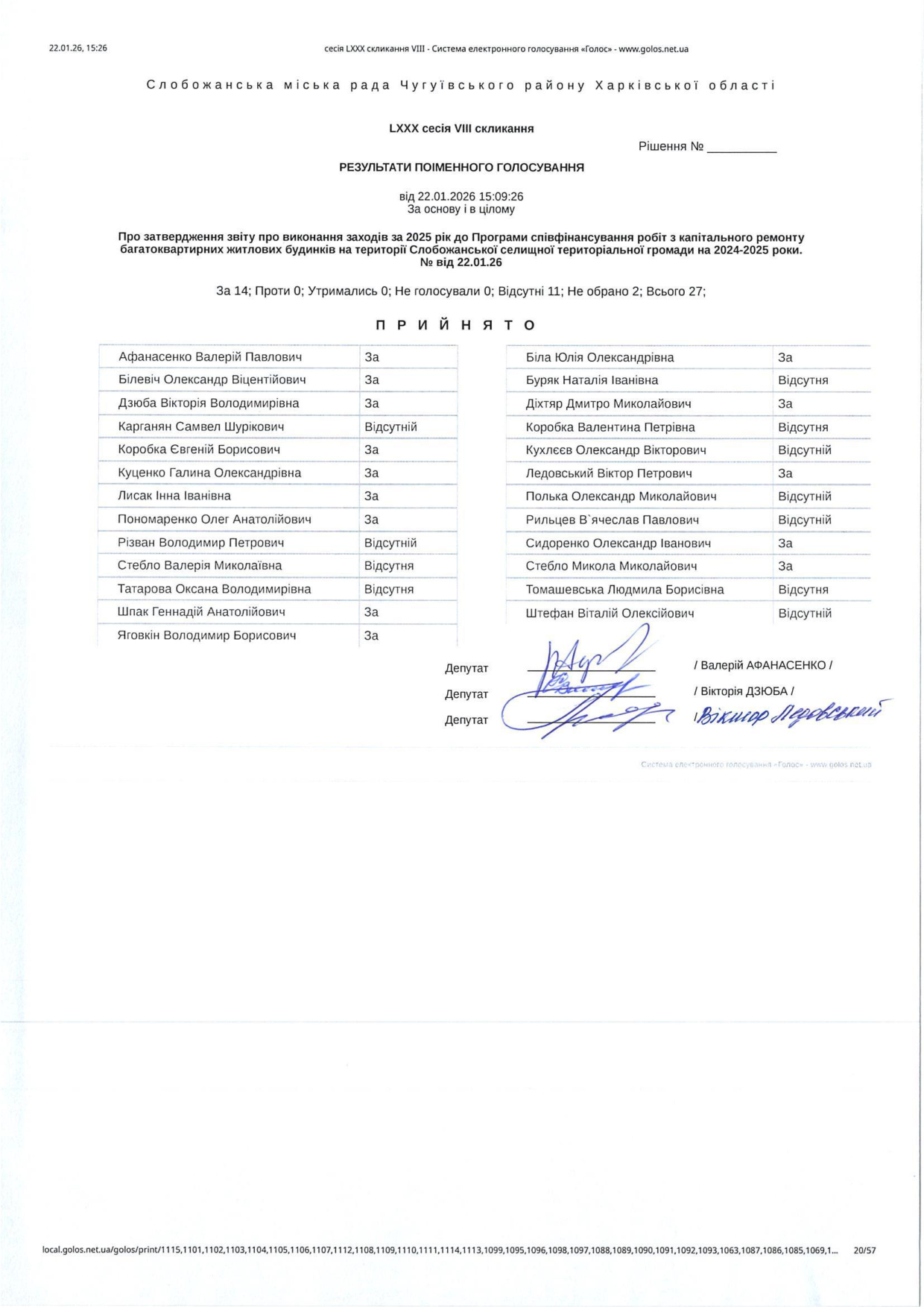 Відомості голосування до рішення сесії №3443 Про затвердження звіту про виконання заходів за 2025 рік до Програми співфінансування робіт з капітального ремонту багатоквартирних житлових будинків на території Слобожанської селищної територіальної громади на 2024-2025 роки