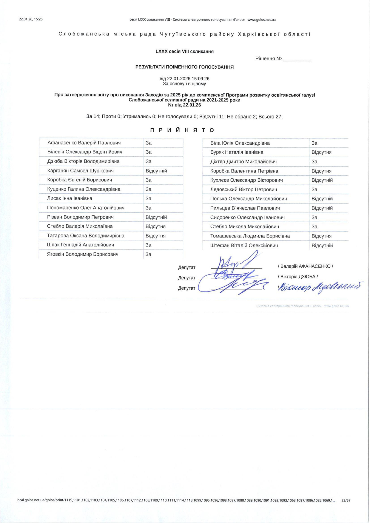 Відомості голосування до рішення сесії №3445 Про затвердження звіту про виконання Заходів за 2025 рік до комплексної Програми розвитку освітянської галузі Слобожанської селищної ради на 2021-2025 роки