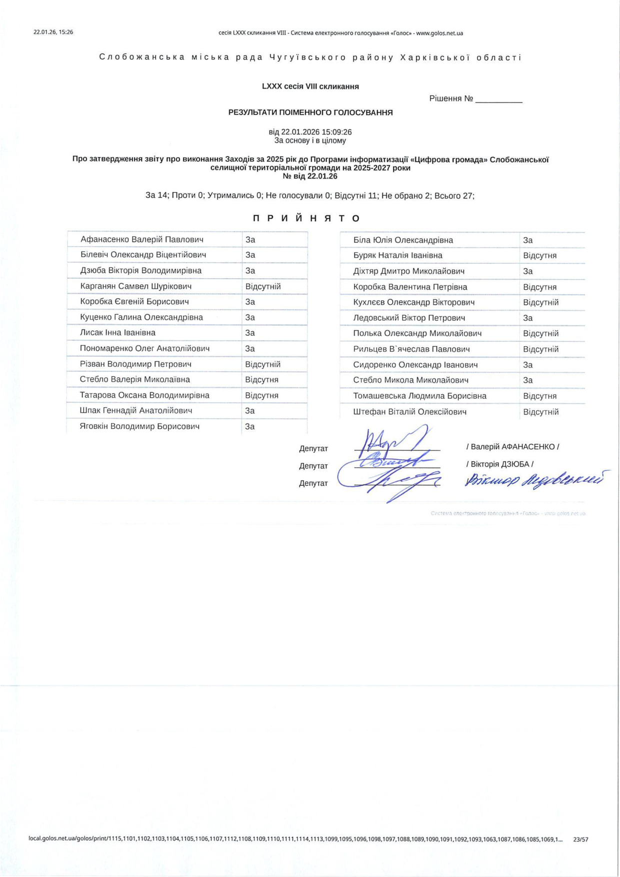 Відомості голосування до рішення сесії №3446 Про затвердження звіту про виконання Заходів за 2025 рік до Програми інформатизації «Цифрова громада» Слобожанської селищної територіальної громади на 2025-2027 роки