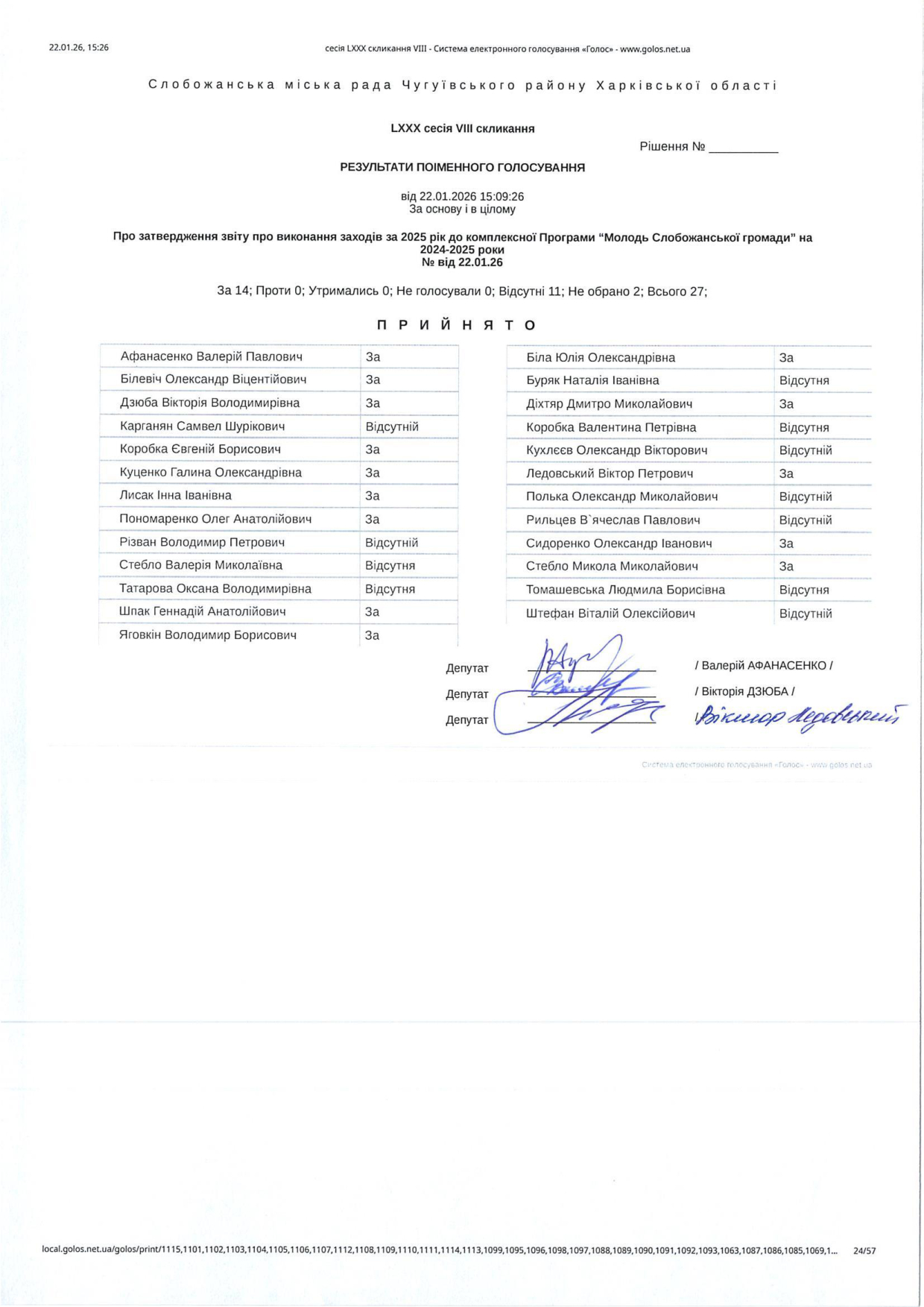 Відомості голосування до рішення сесії №3447 Про затвердження звіту про виконання заходів за 2025 рік до комплексної Програми «Молодь Слобожанської громади» на 2024-2025 роки