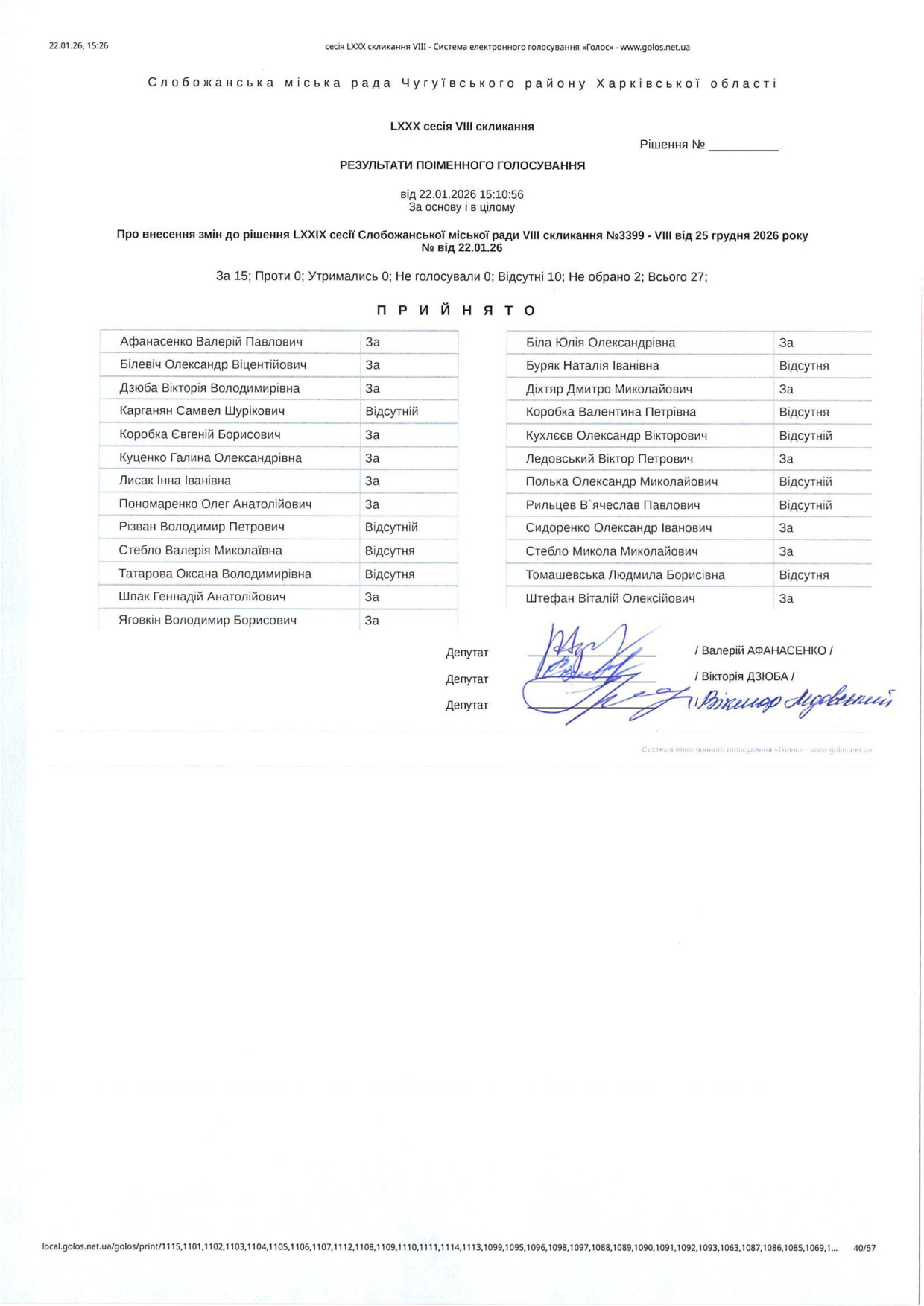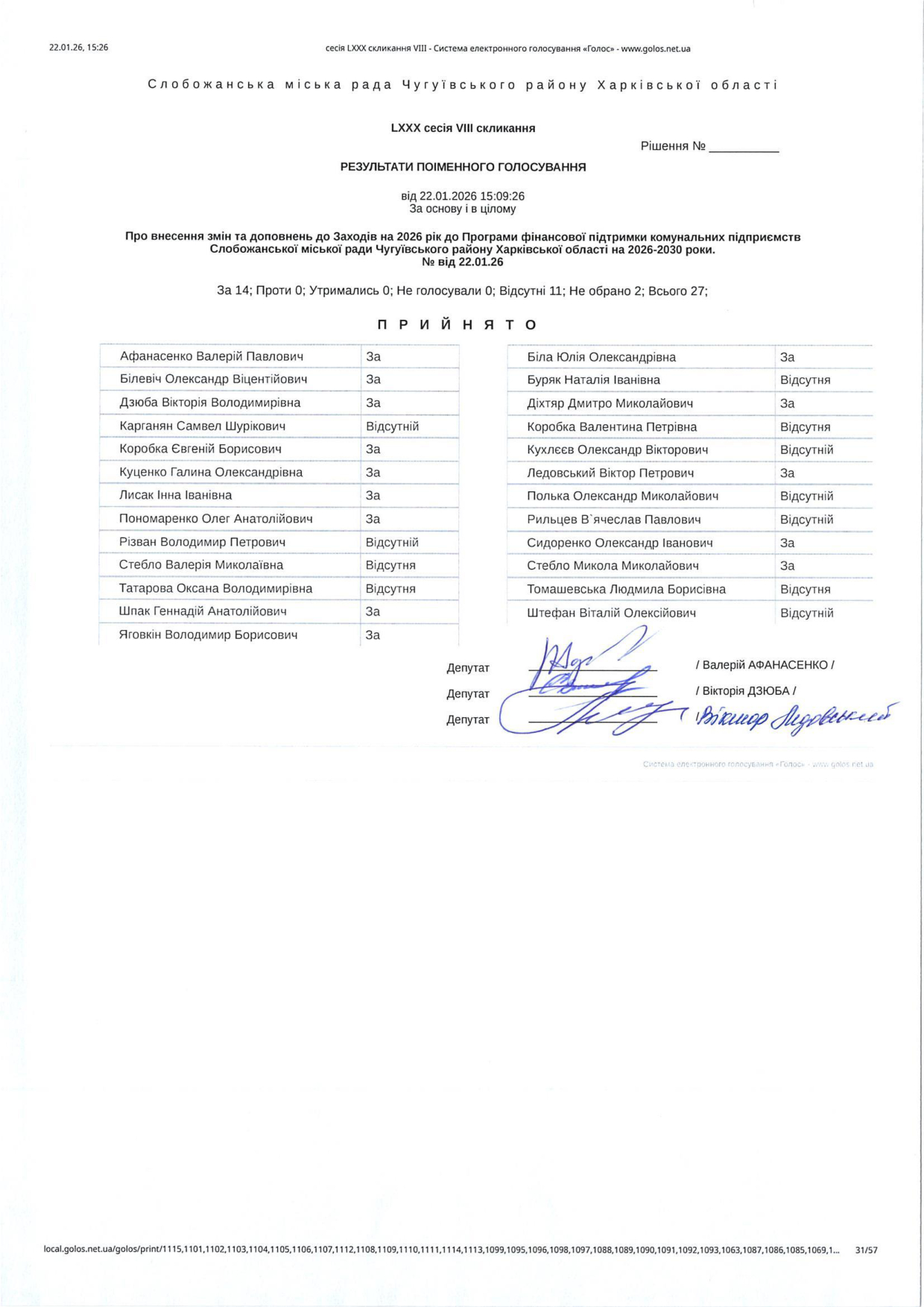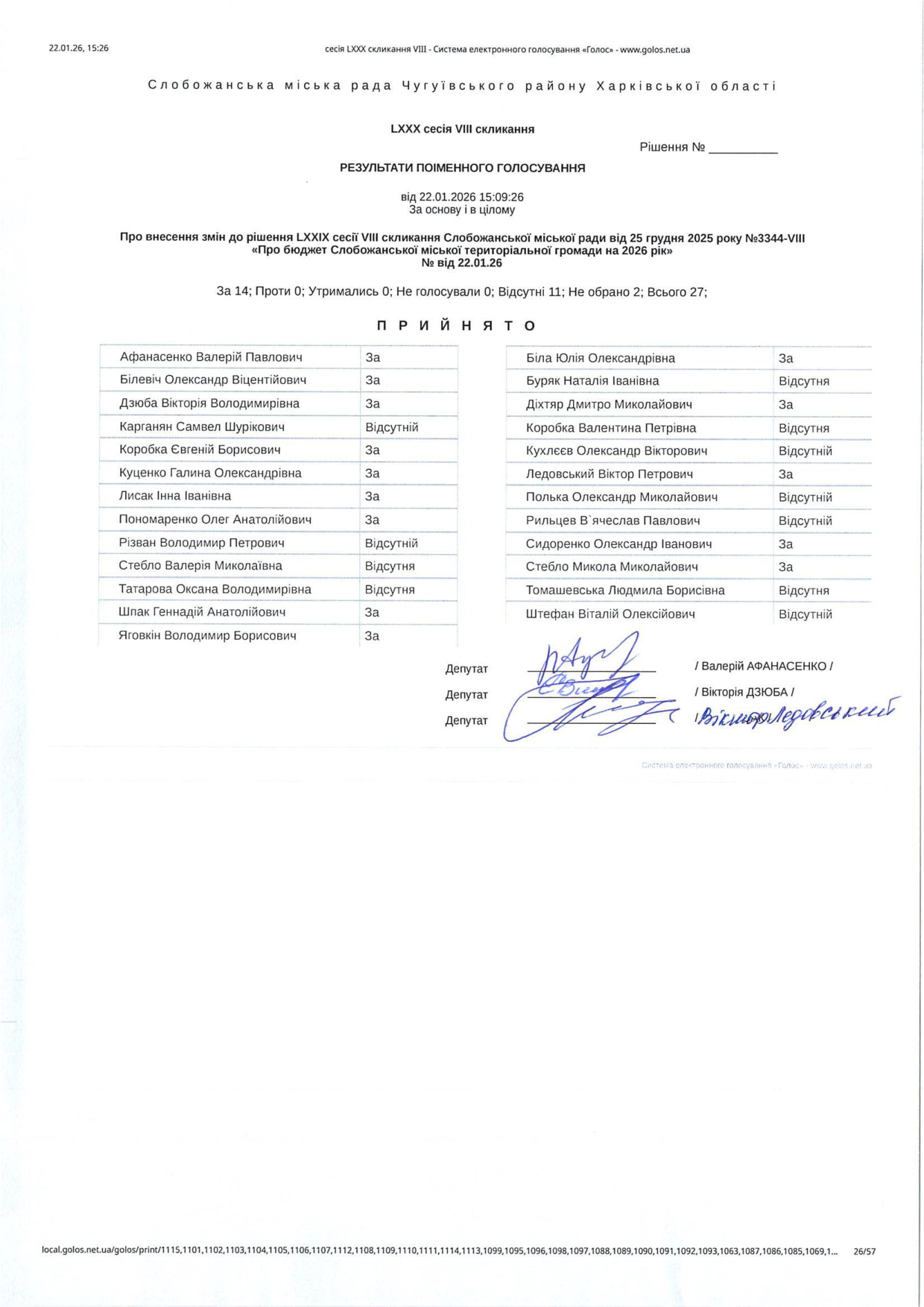 Відомості голосування до рішення сесії №3449 Про внесення змін до рішення LXXIX сесії VIII скликання Слобожанської міської ради від 25 грудня 2025 року №3344-VIII «Про бюджет Слобожанської міської територіальної громади на 2026 рік»