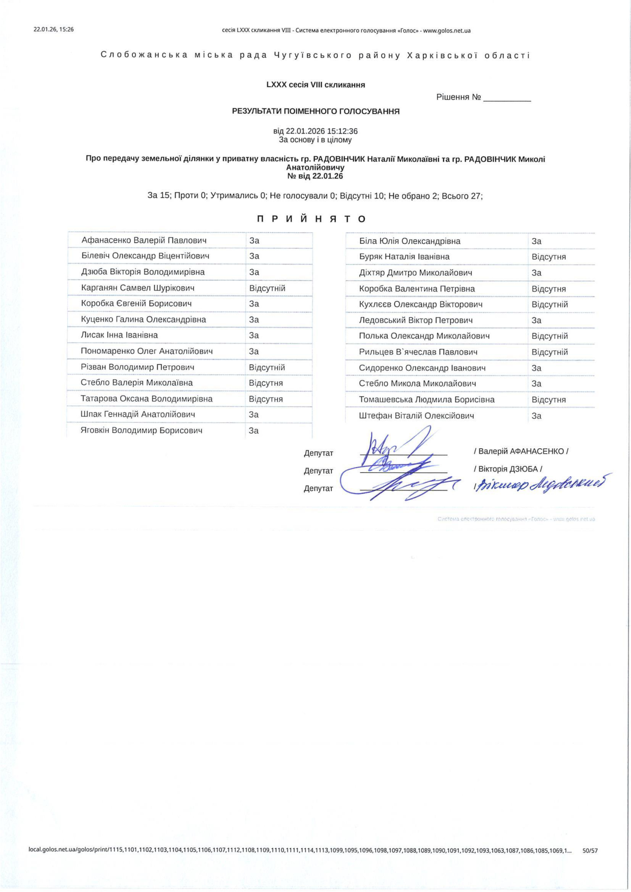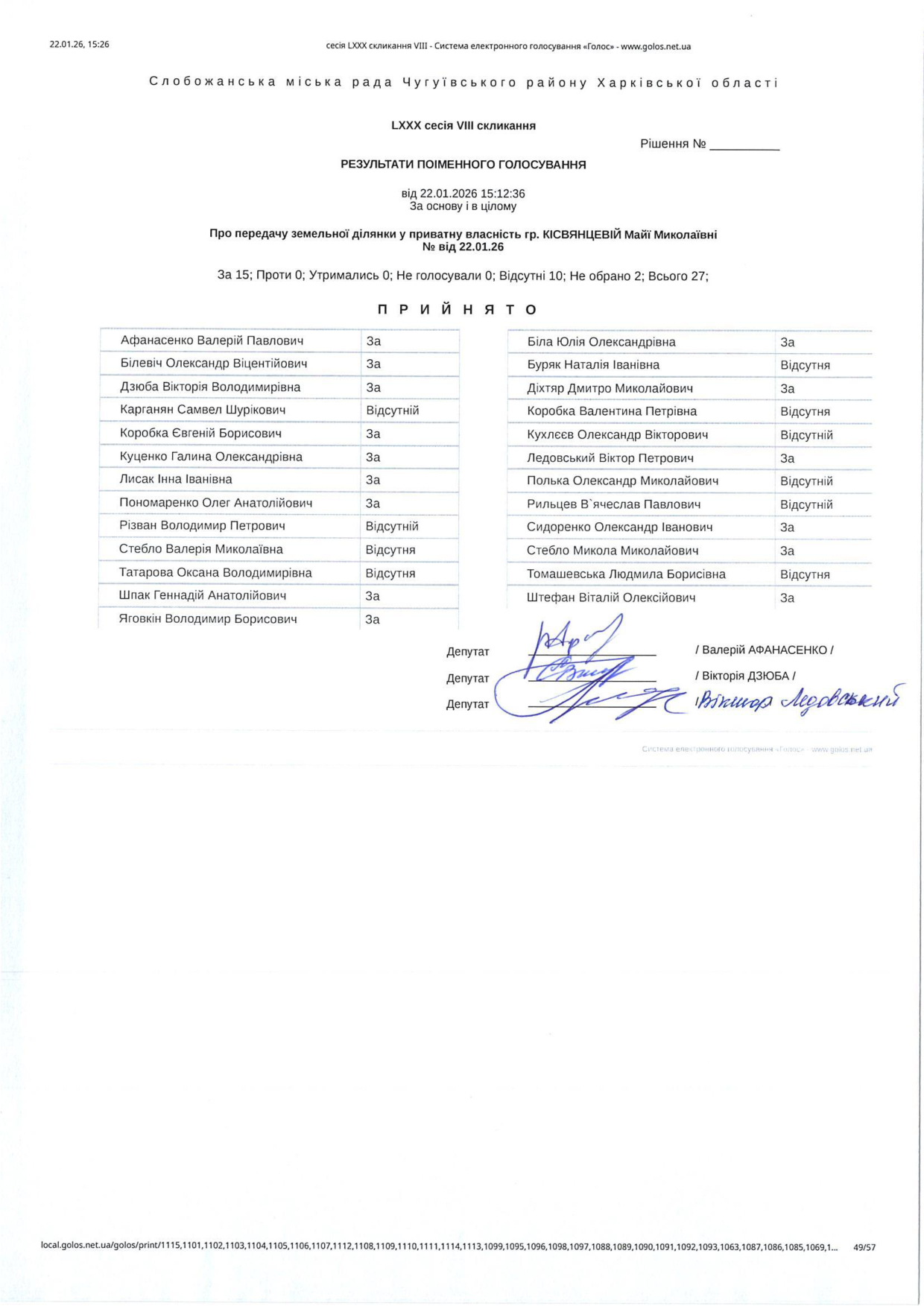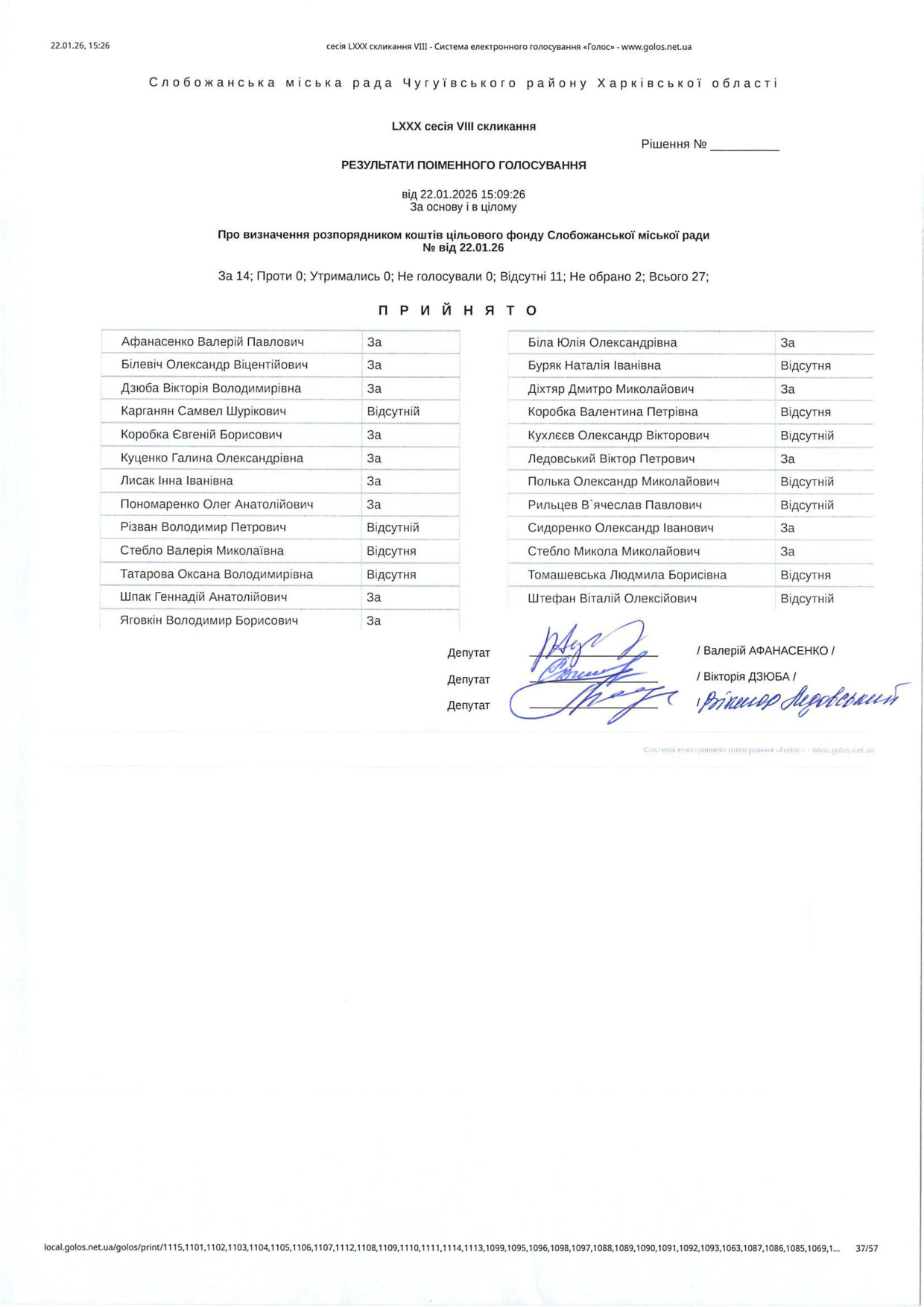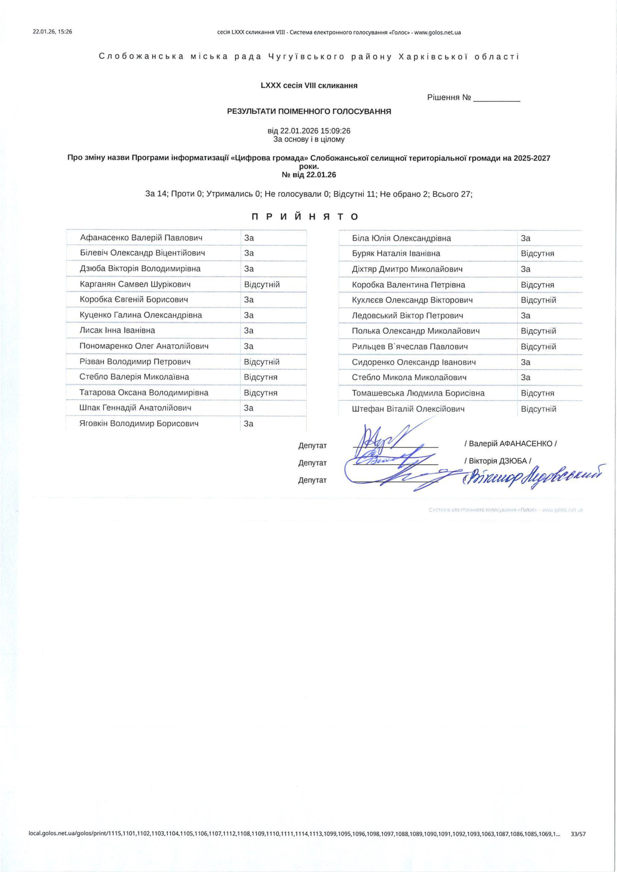 Відомості голосування до рішення сесії №3449 Про внесення змін до рішення LXXIX сесії VIII скликання Слобожанської міської ради від 25 грудня 2025 року №3344-VIII «Про бюджет Слобожанської міської територіальної громади на 2026 рік»