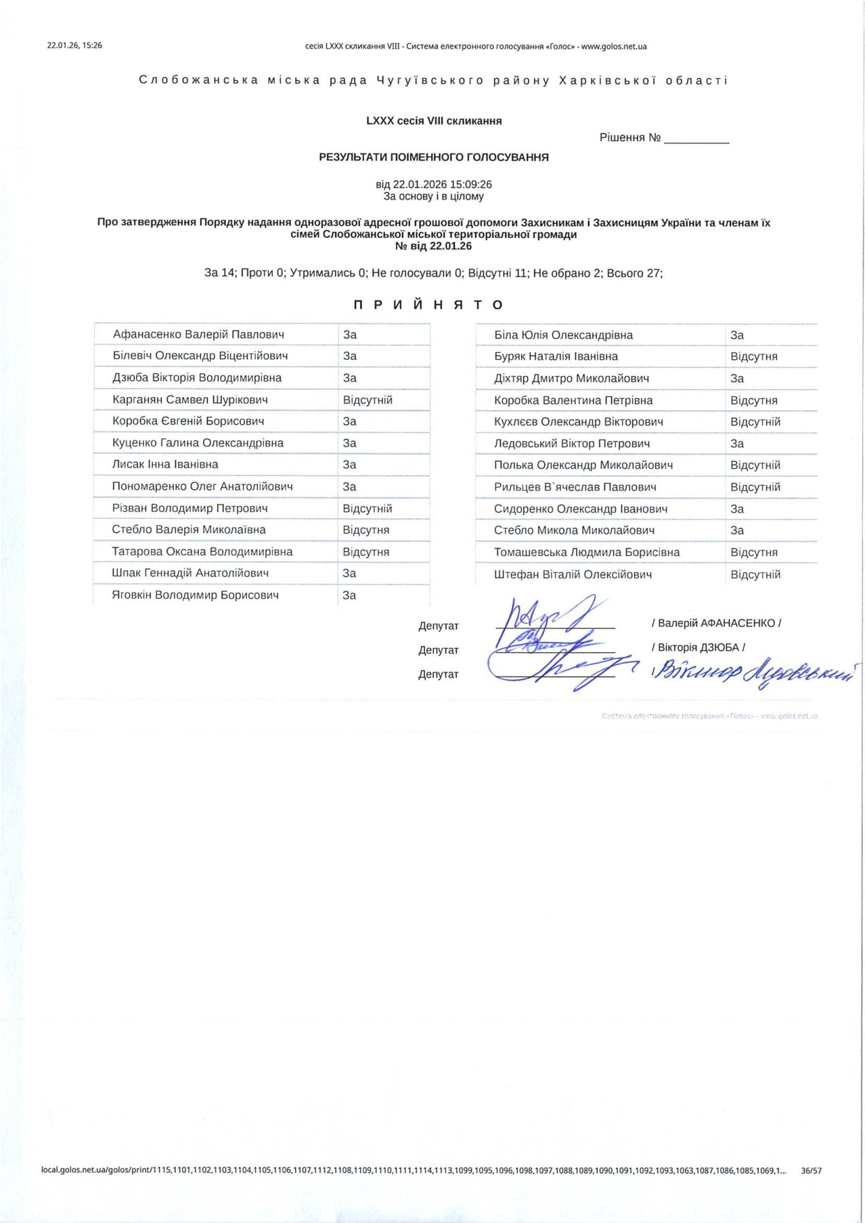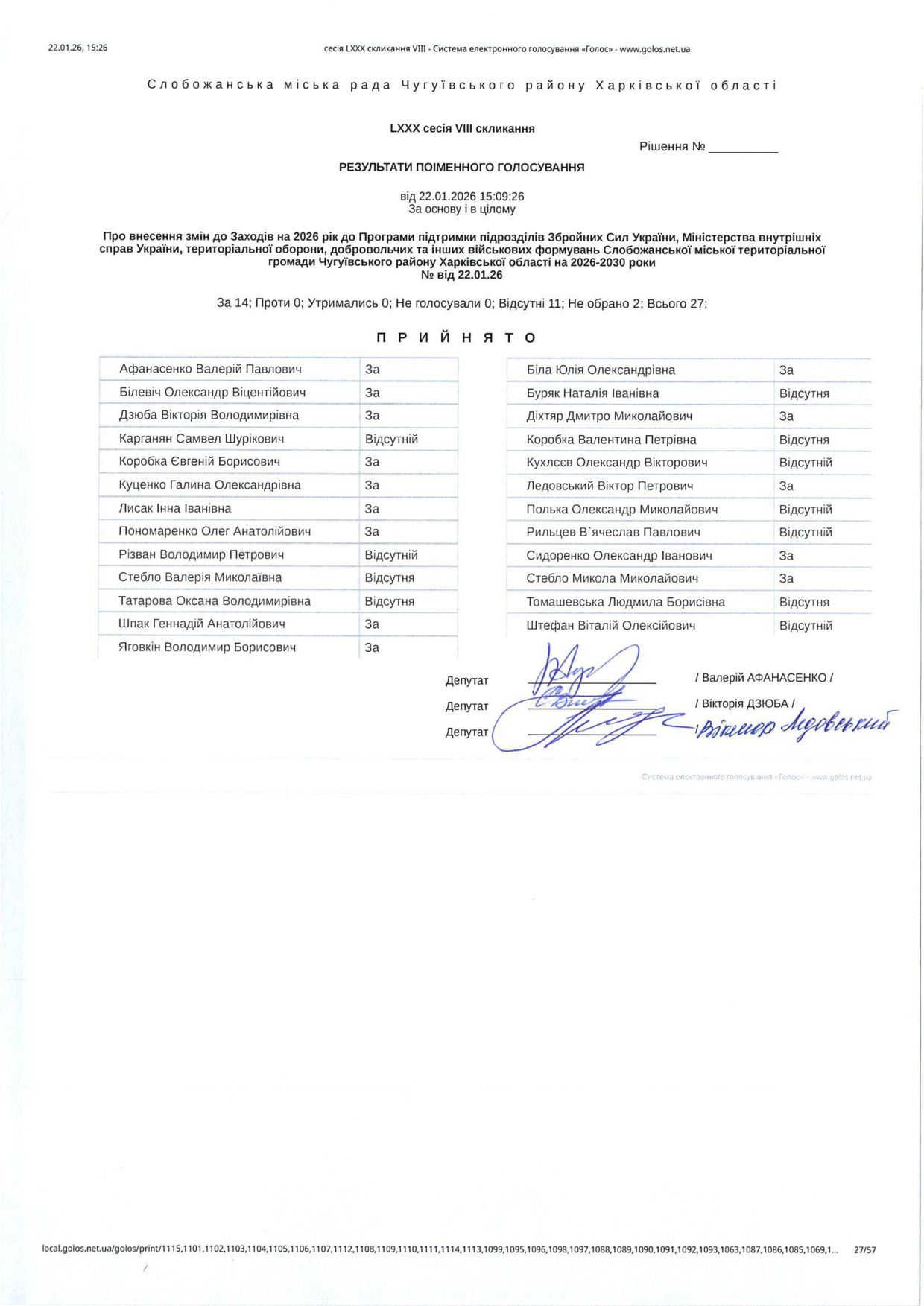 Відомості голосування до рішення сесії №3450 Про внесення змін до Заходів на 2026 рік до Програми підтримки підрозділів Збройних Сил України, Міністерства внутрішніх справ України, територіальної оборони, добровольчих та інших військових формувань Слобожанської міської територіальної громади Чугуївського району Харківської області на 2026-2030 роки