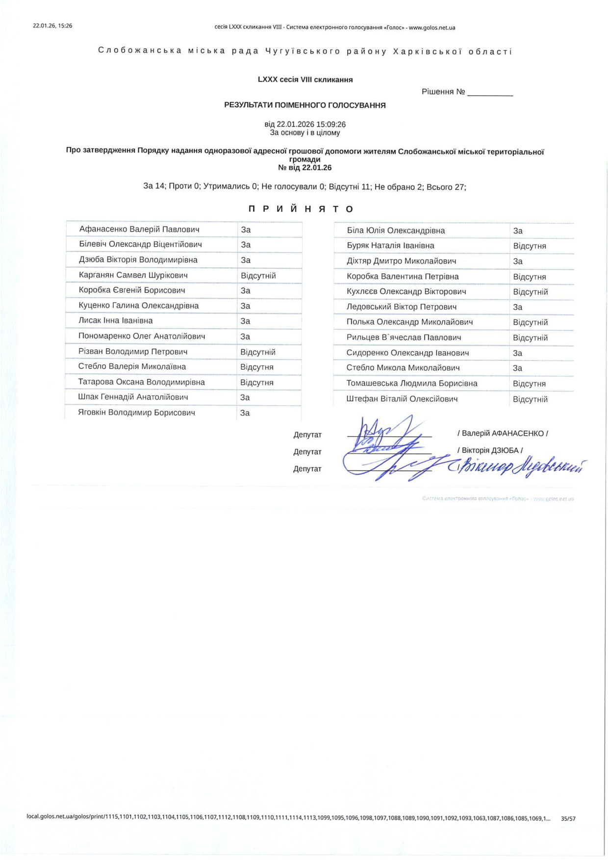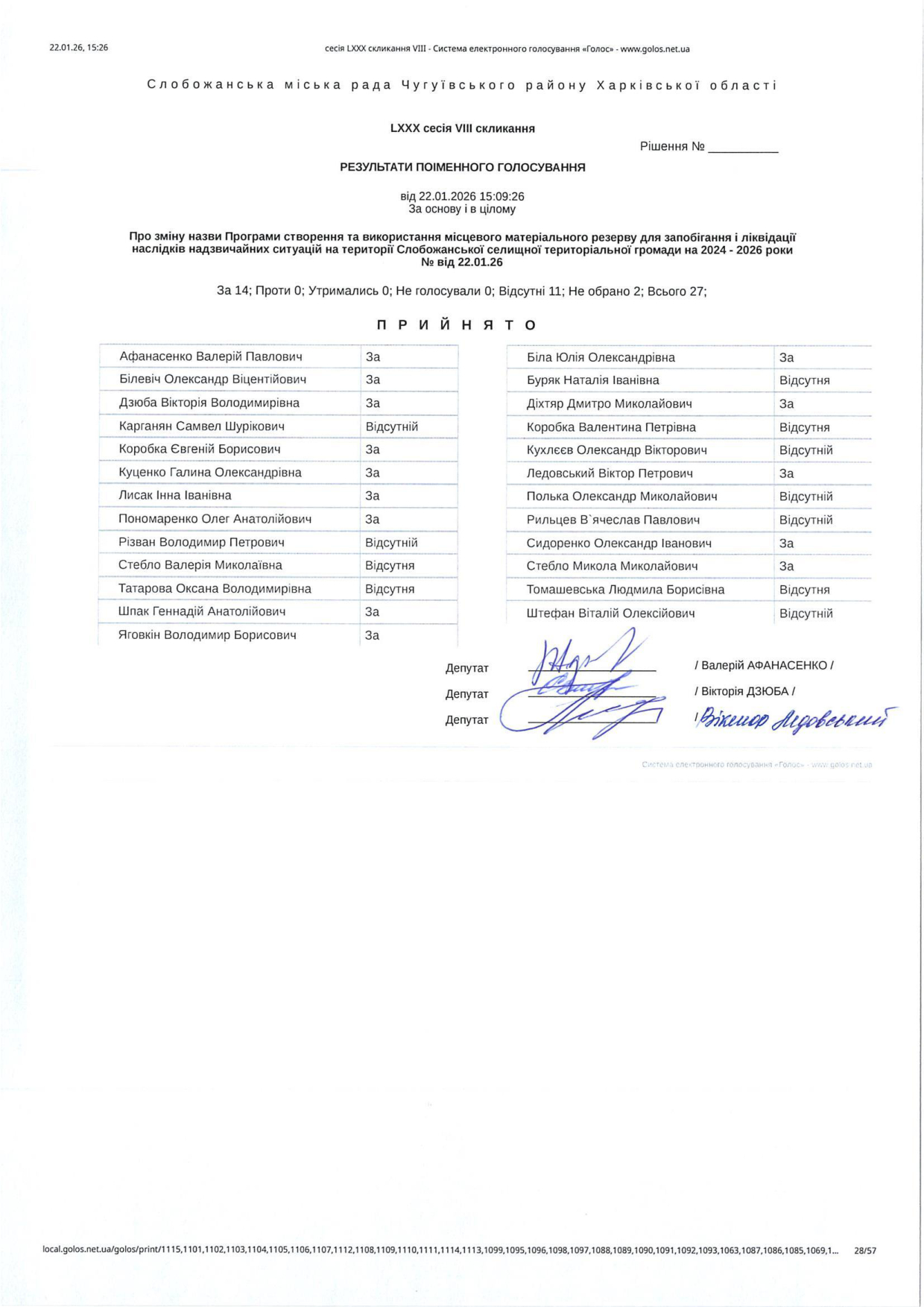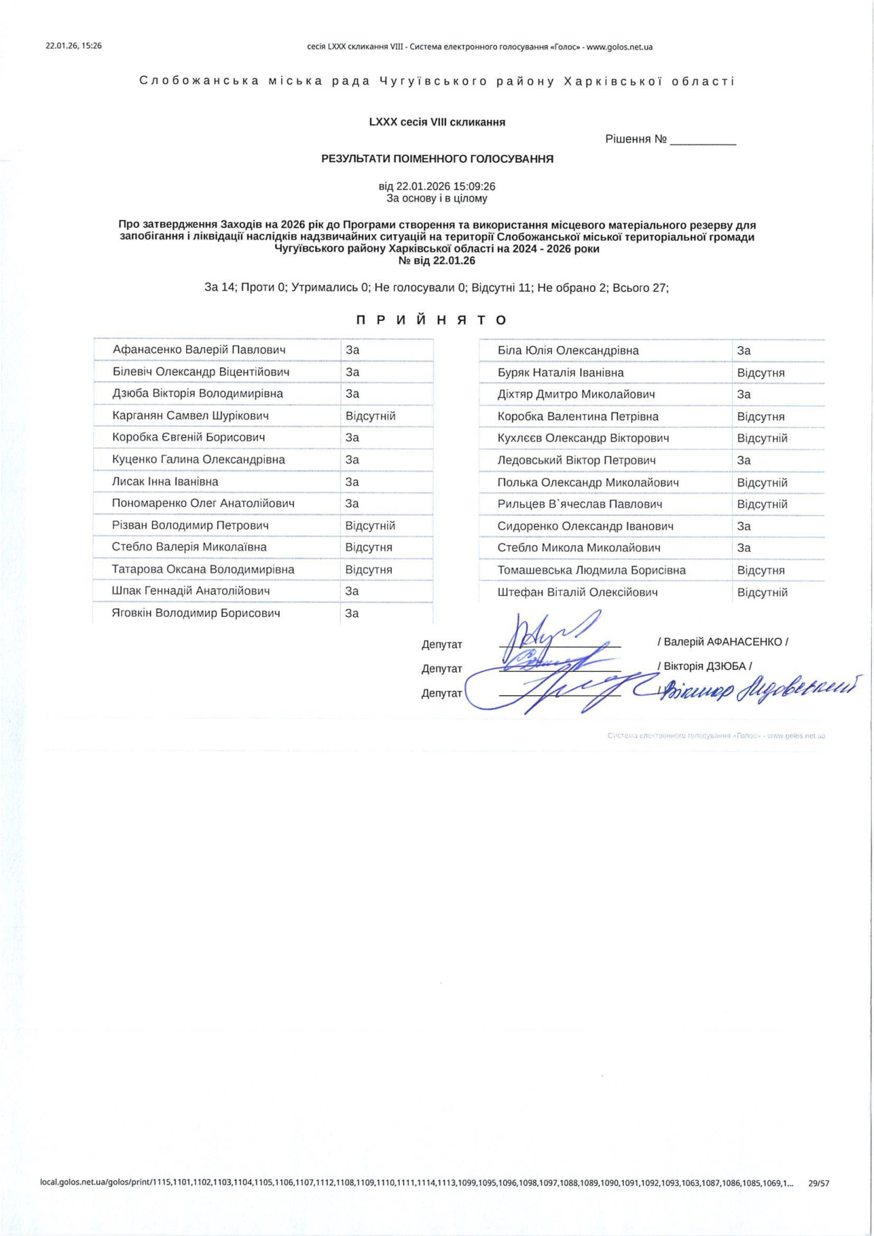 Відомості голосування до рішення сесії №3452 Про затвердження Заходів на 2026 рік до Програми створення та використання місцевого матеріального резерву для запобігання і ліквідації наслідків надзвичайних ситуацій на території Слобожанської міської територіальної громади Чугуївського району Харківської області на 2024 - 2026 роки