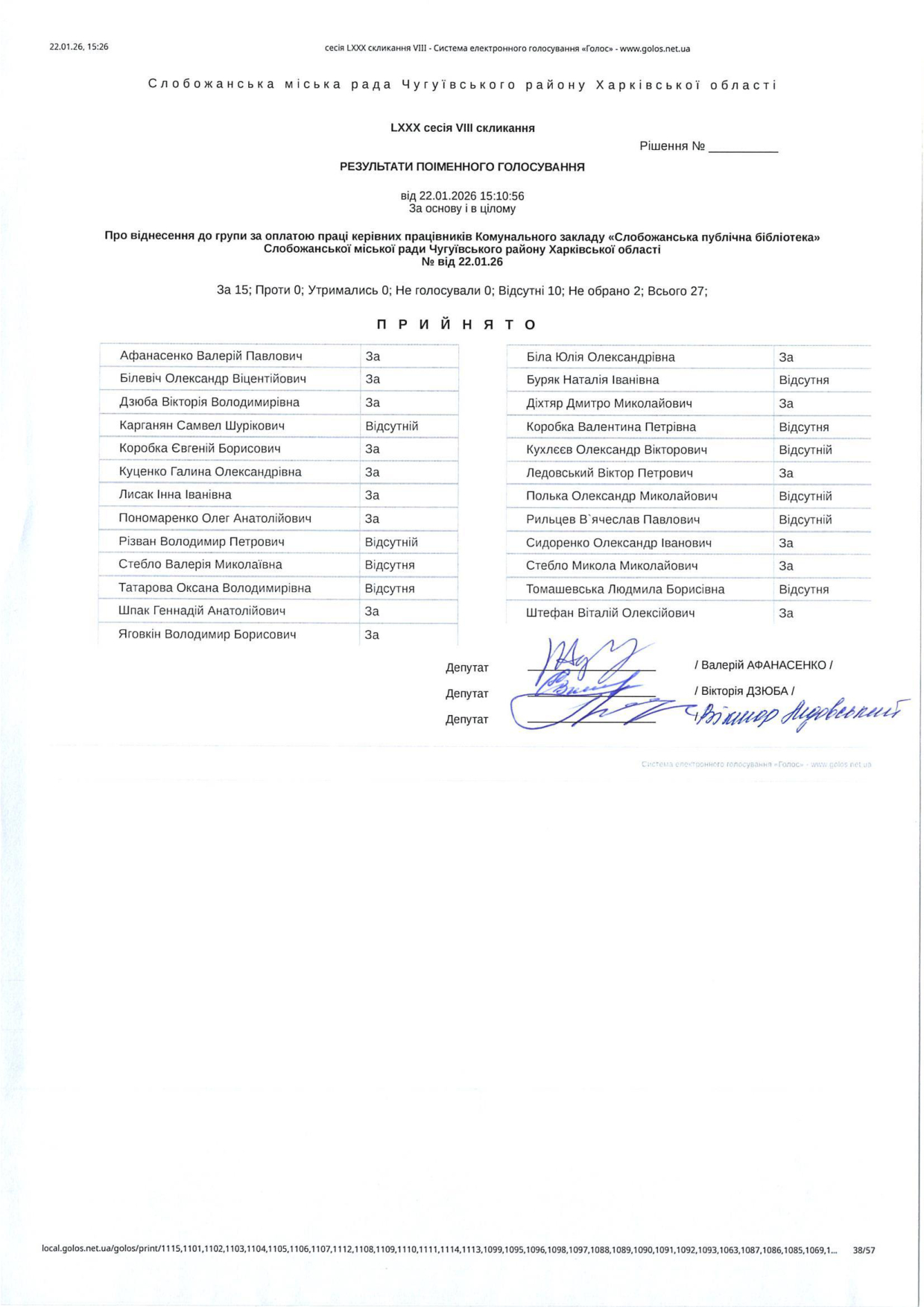Відомості голосування до рішення сесії №3461 Про віднесення до групи за оплатою праці керівних працівників Комунального закладу «Слобожанська публічна бібліотека» Слобожанської міської ради Чугуївського району Харківської області