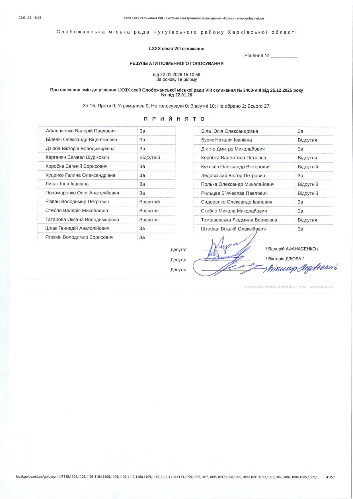 Відомості голосування до рішення сесії №3463 Про внесення змін до рішення LХХІХ сесії Слобожанської міської ради VIII скликання №3399 - VIІІ від 25 грудня 2026 року
