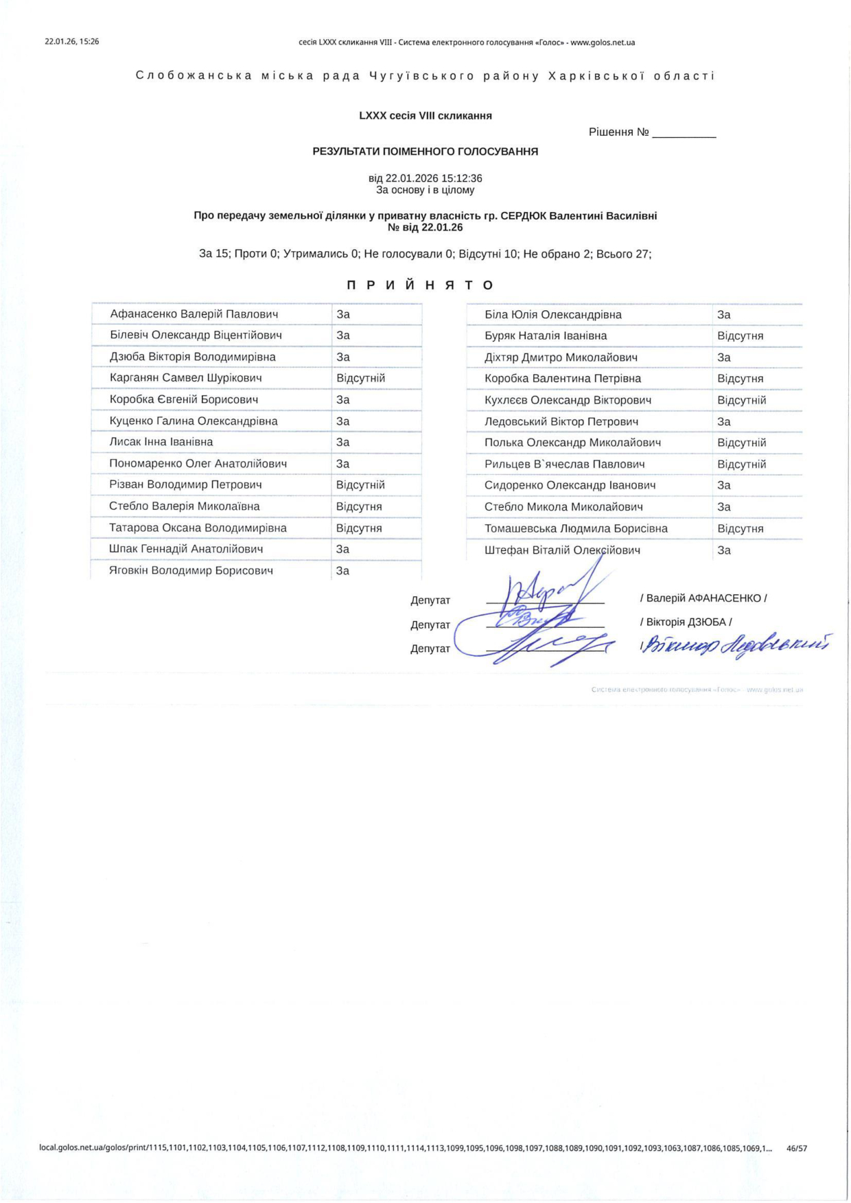 Відомості голосування до рішення сесії №3469 Про передачу земельної ділянки у приватну власність гр. СЕРДЮК Валентині Василівні