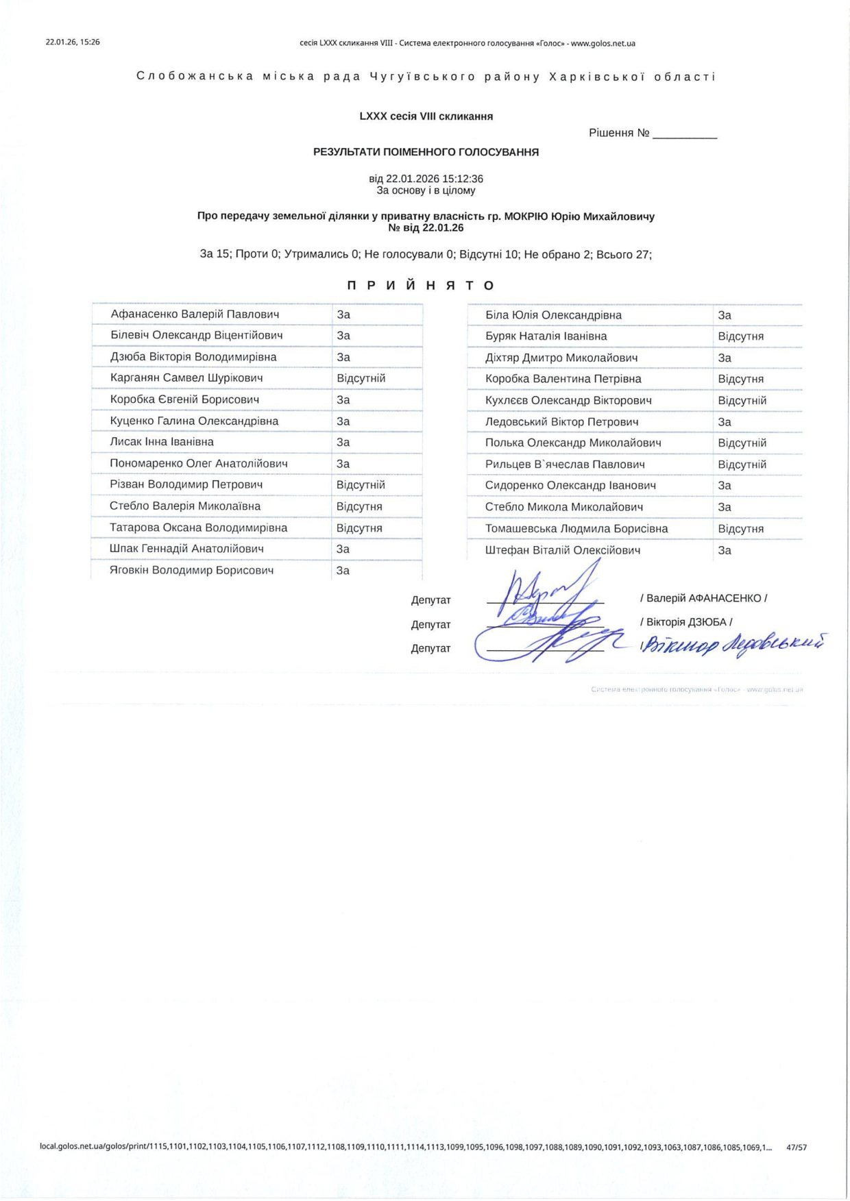 Відомості голосування до рішення сесії №3470 Про передачу земельної ділянки у приватну власність гр. МОКРІЮ Юрію Михайловичу