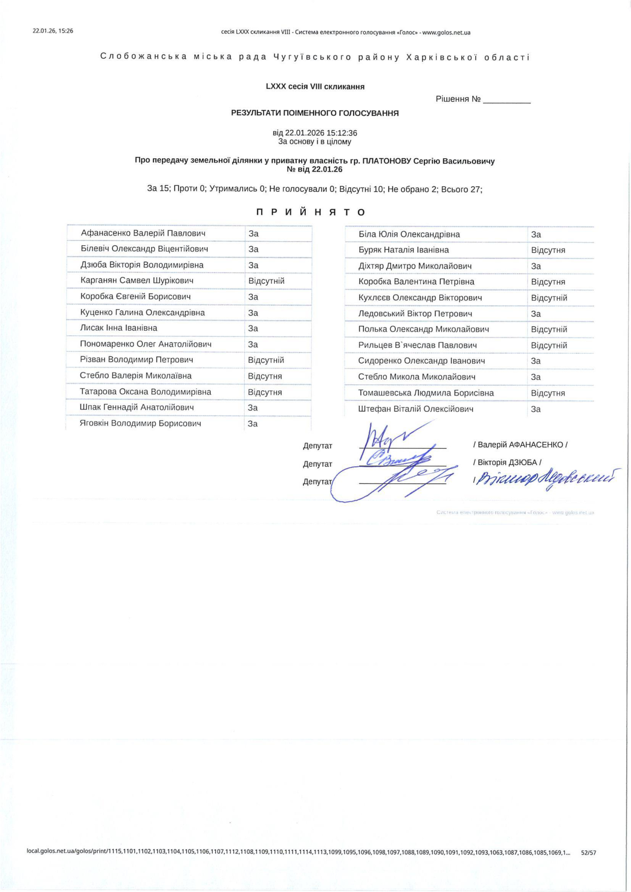Відомості голосування до рішення сесії №3475 Про передачу земельної ділянки у приватну власність гр. ПЛАТОНОВУ Сергію Васильовичу