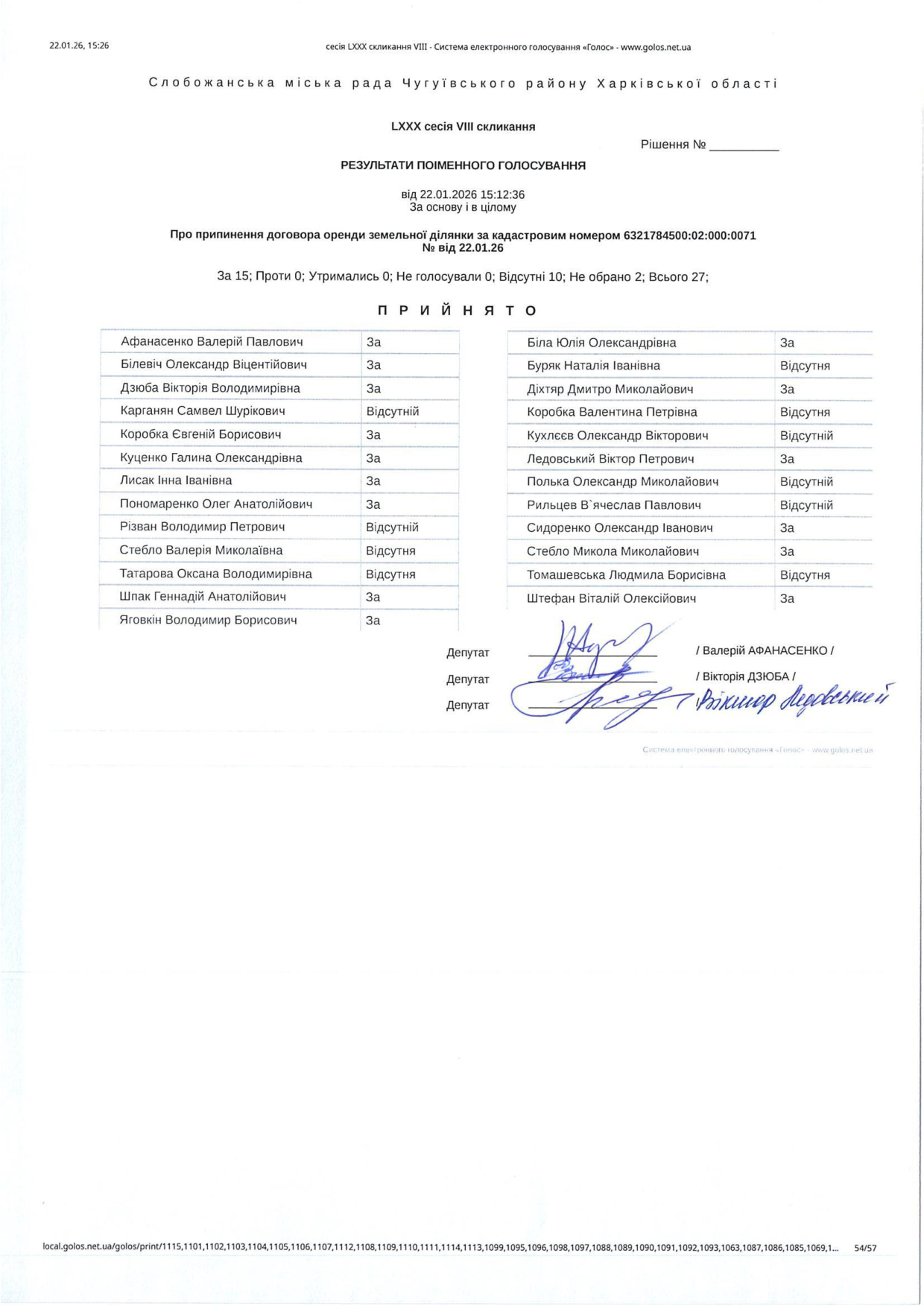 Відомості голосування до рішення сесії №3477 Про припинення договора оренди земельної ділянки за кадастровим номером 6321784500:02:000:0071