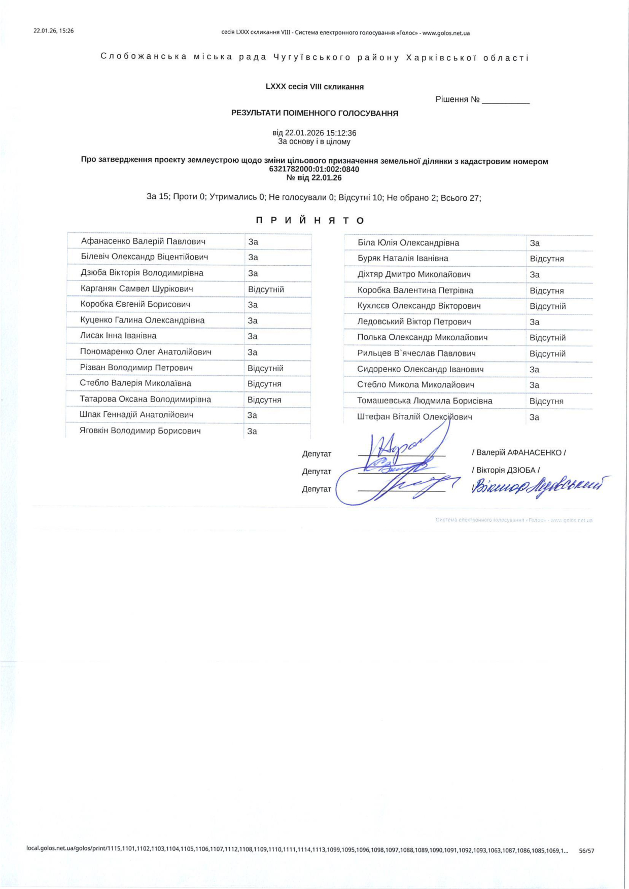 Відомості голосування до рішення сесії №3479 Про затвердження проекту землеустрою щодо зміни цільового призначення земельної ділянки з кадастровим номером 6321782000:01:002:0840