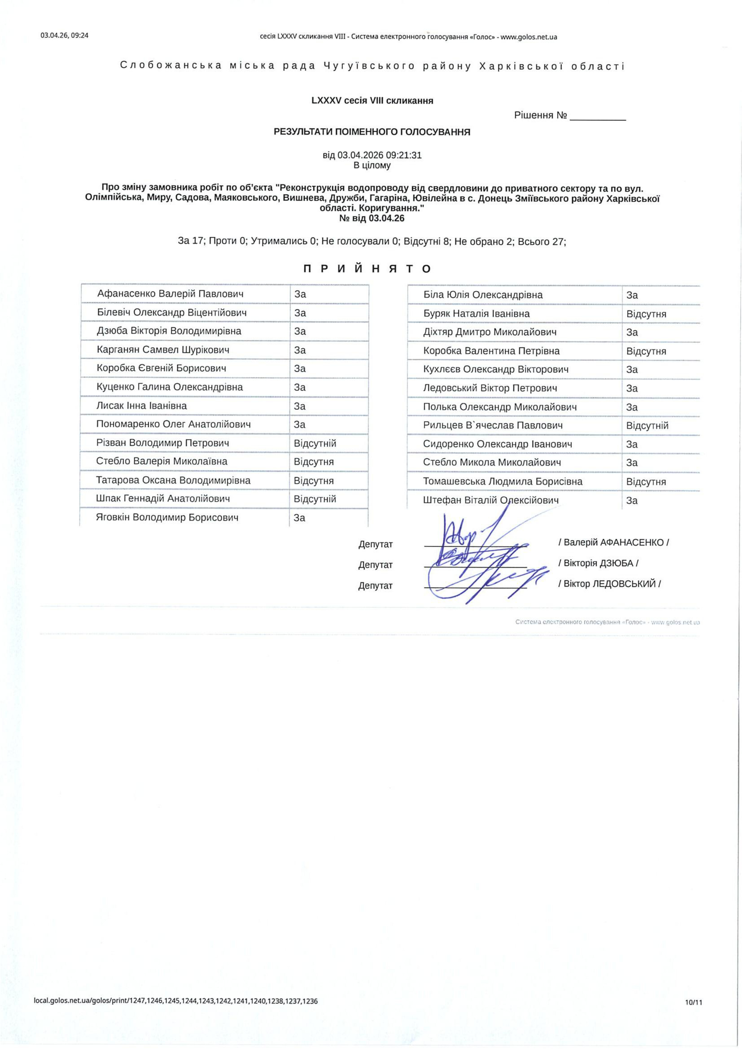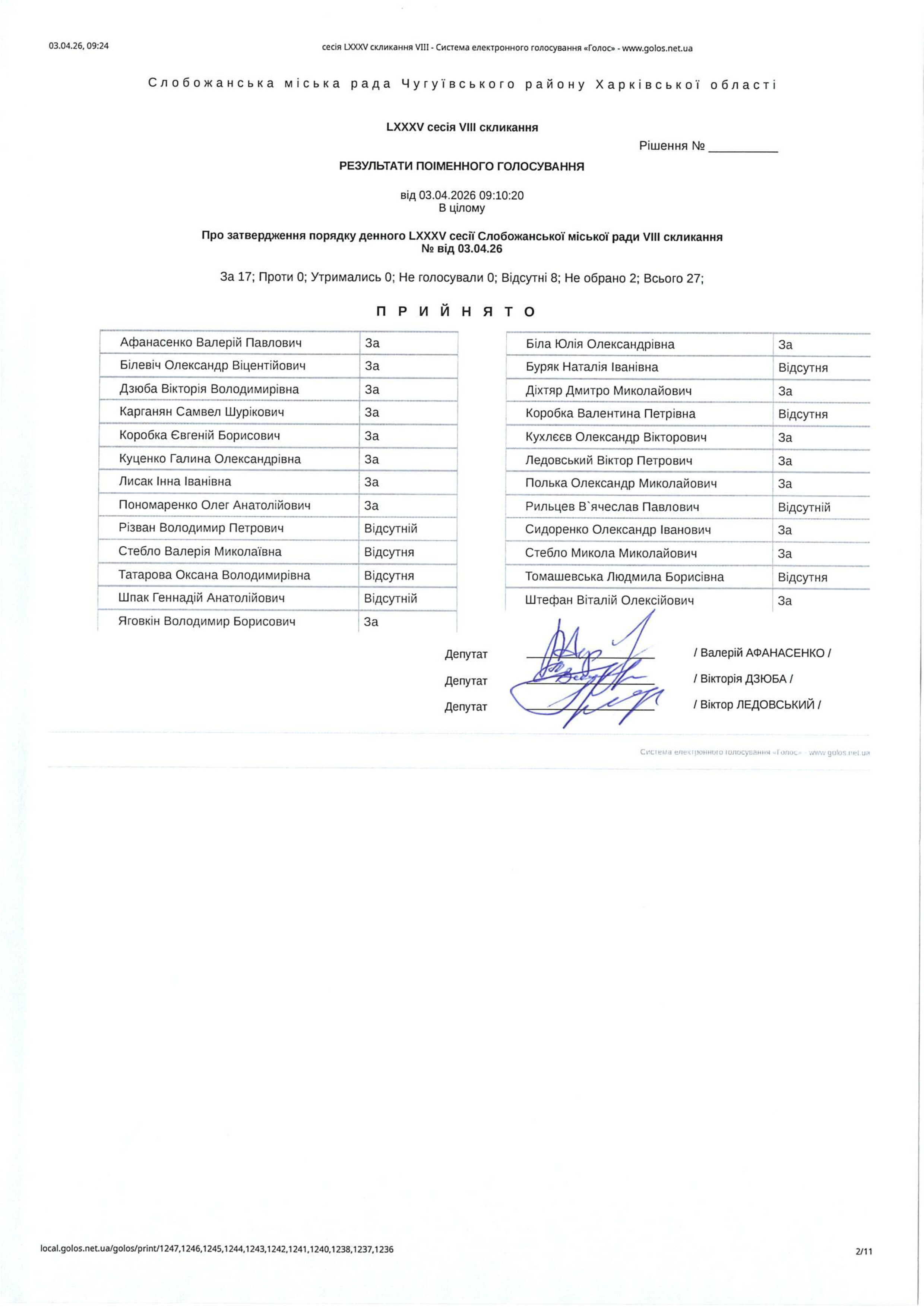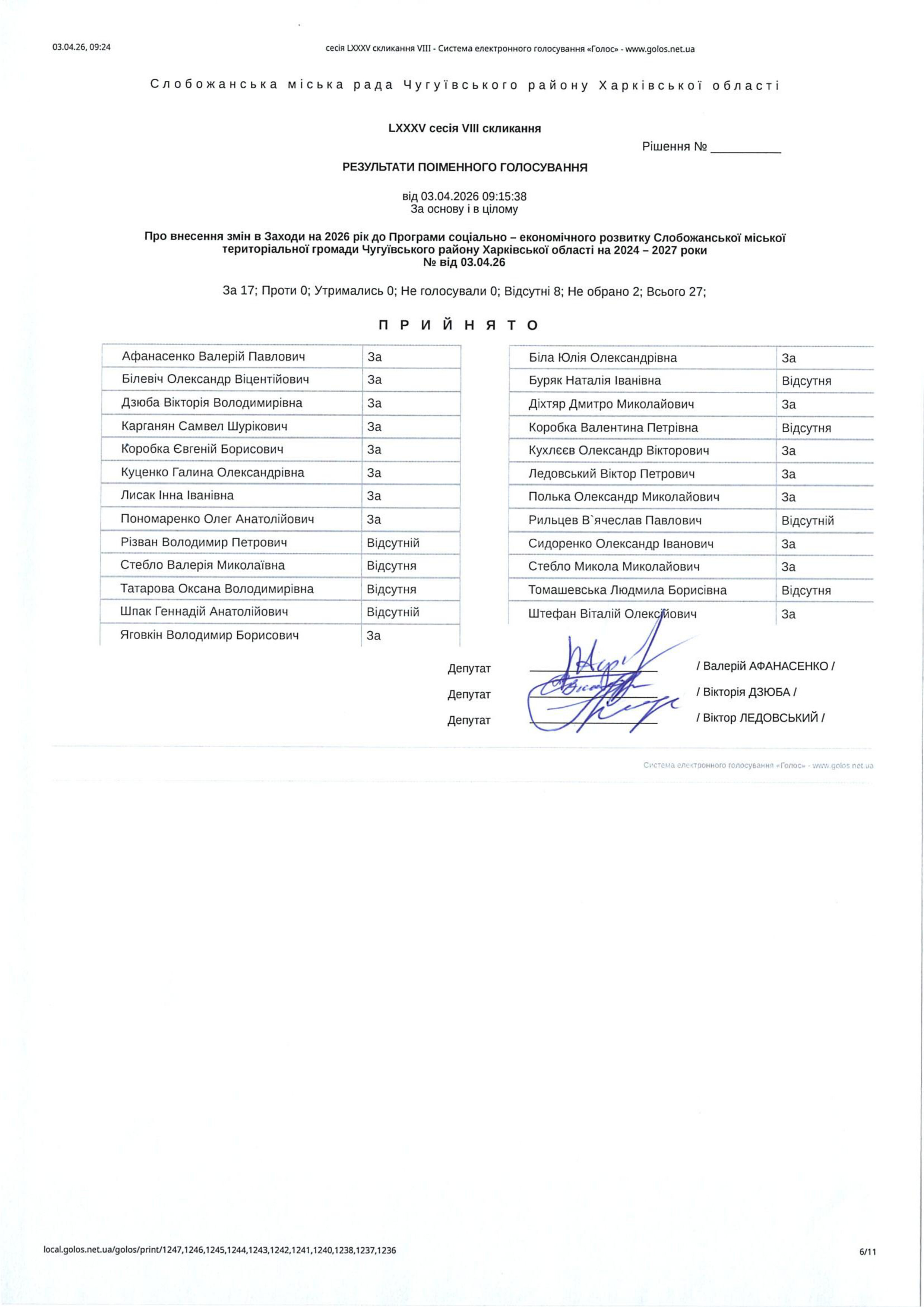 Відомість голосування до рішення сесії №3588 Про внесення змін до Заходів на 2026 рік до місцевої цільової Програми розвитку цивільного захисту на території Слобожанської міської територіальної громади Чугуївського району Харківської області на 2026-2030 роки