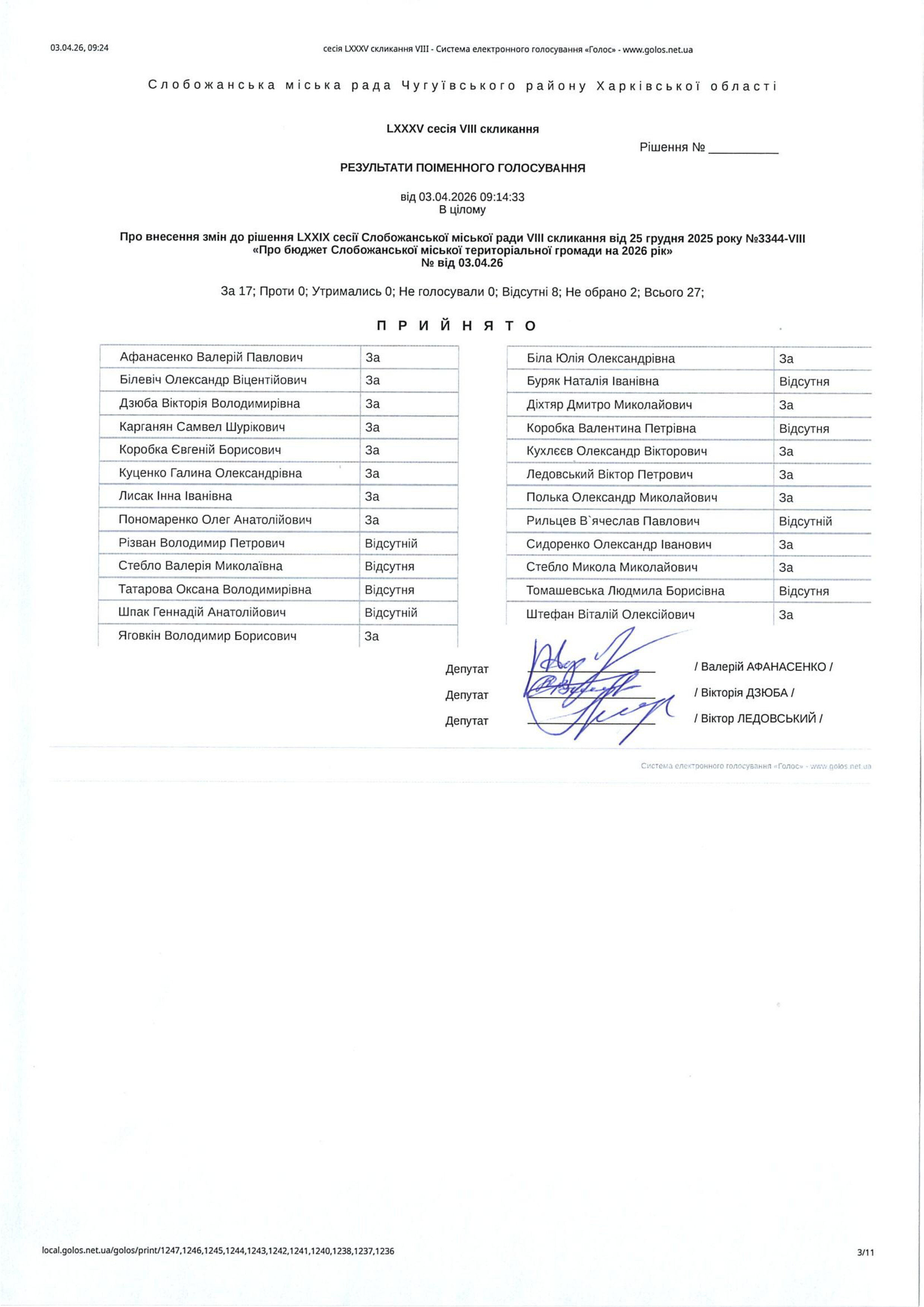 Відомість голосування до рішення сесії №3587 Про внесення змін до рішення LXXIX сесії Слобожанської міської ради VIII скликання від 25 грудня 2025 року №3344-VIII «Про бюджет Слобожанської міської територіальної громади на 2026 рік»
