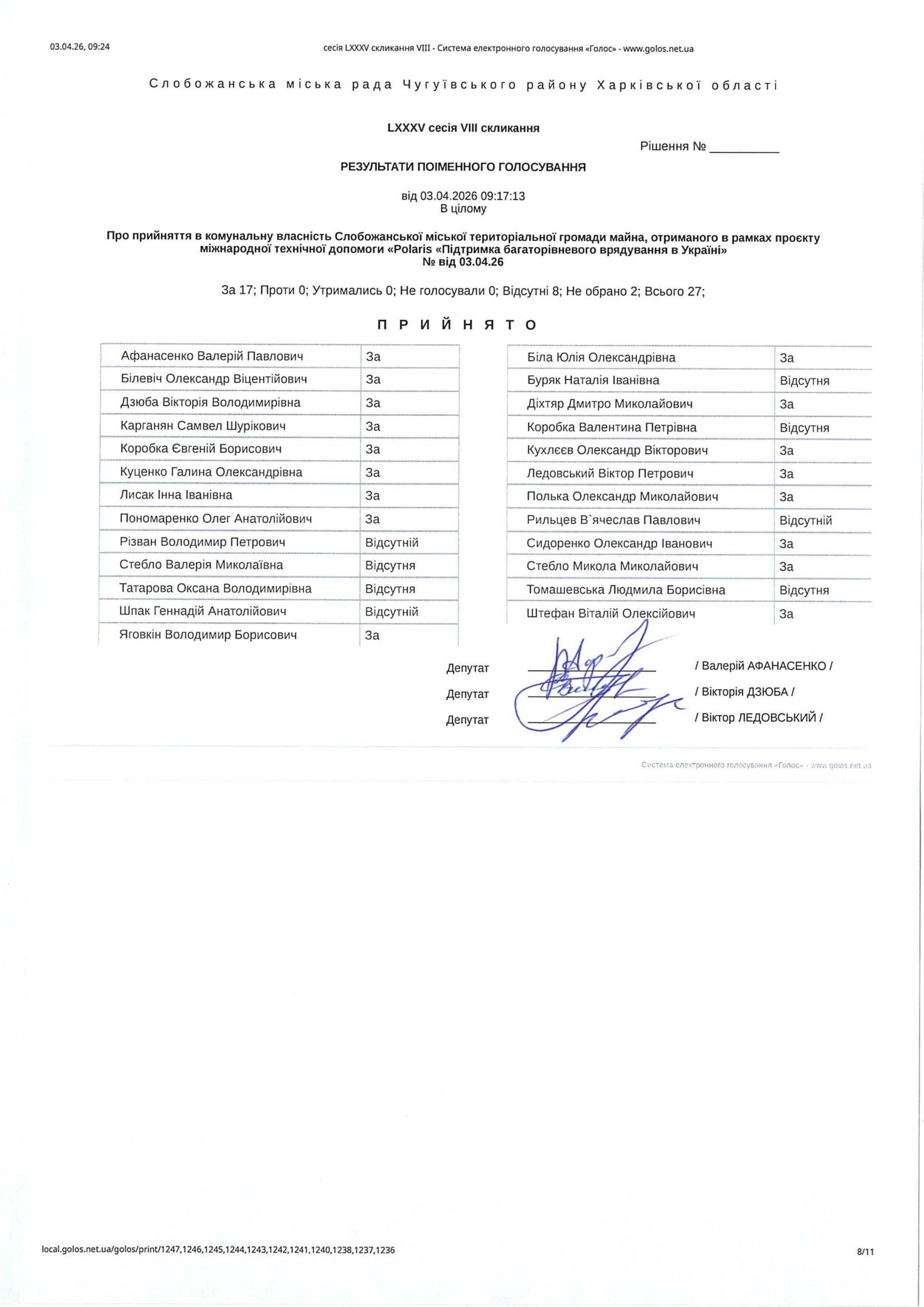 Відомість голосування до рішення сесії №3592 Про прийняття в комунальну власність Слобожанської міської територіальної громади майна, отриманого в рамках проєкту міжнародної технічної допомоги «Polaris «Підтримка багаторівневого врядування в Україні»